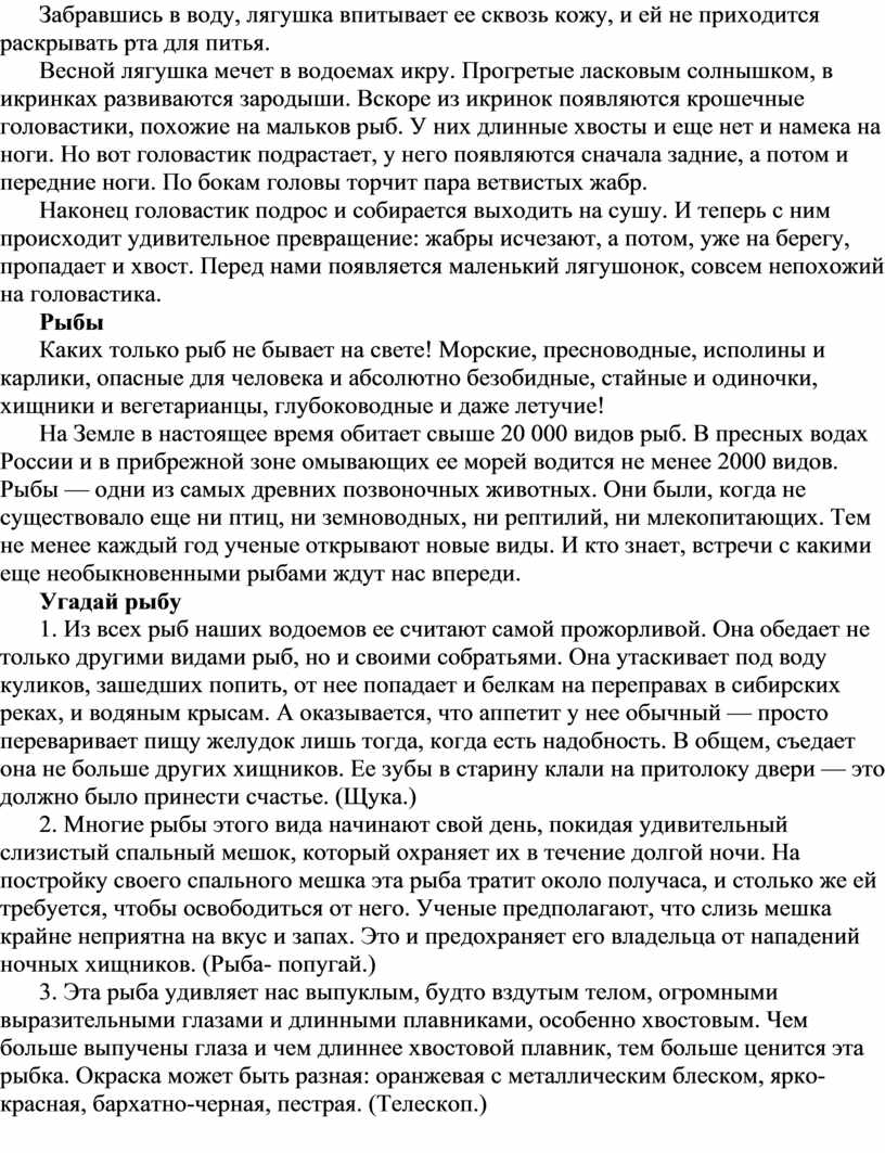 1. Из всех рыб наших водоемов ее считают самой прожорливой. Она обедает не только другими видами рыб, но и своими собратьями. Она утаскивает под воду куликов, зашедших попить, от нее попадает и белкам на переправах в сибирских реках, и водяным крысам. А оказывается, что аппетит у нее обычный — просто переваривает пищу желудок лишь тогда, когда есть надобность. В общем, съедает она не больше других хищников. Ее зубы в старину клали на притолоку двери — это должно было принести счастье. (Щука.)