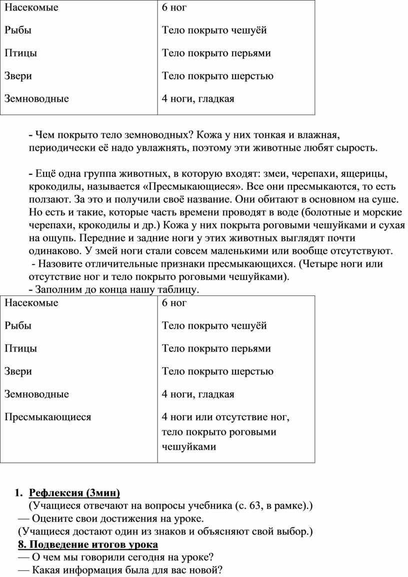 6 ног Тело покрыто чешуёй Тело покрыто перьями Тело покрыто шерстью 4 ноги, гладкая 4 ноги или отсутствие ног, тело покрыто роговыми чешуйками |