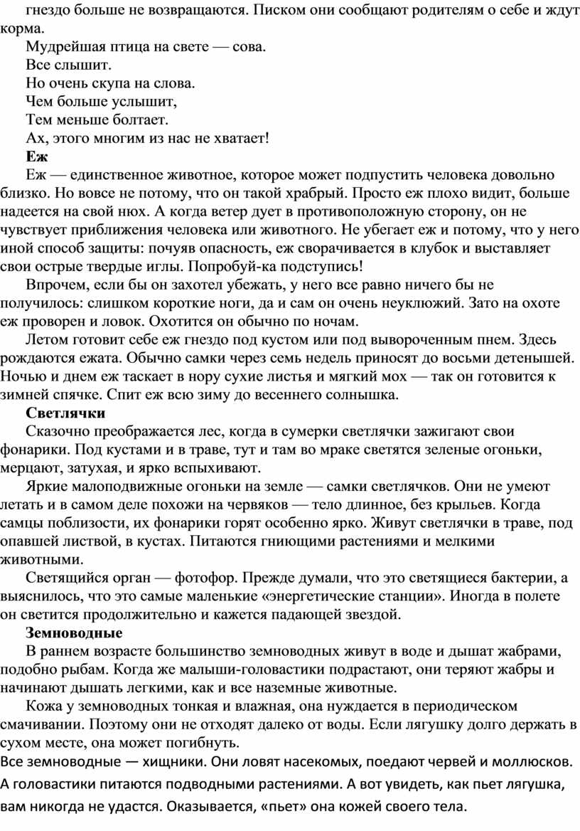 Еж — единственное животное, которое может подпустить человека довольно близко. Но вовсе не потому, что он такой храбрый. Просто еж плохо видит, больше надеется на свой нюх. А когда ветер дует в противоположную сторону, он не чувствует приближения человека или животного. Не убегает еж и потому, что у него иной способ защиты: почуяв опасность, еж сворачивается в клубок и выставляет свои острые твердые иглы. Попробуй-ка подступись!