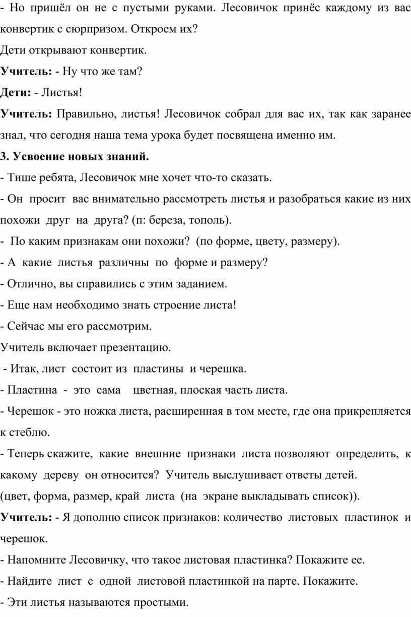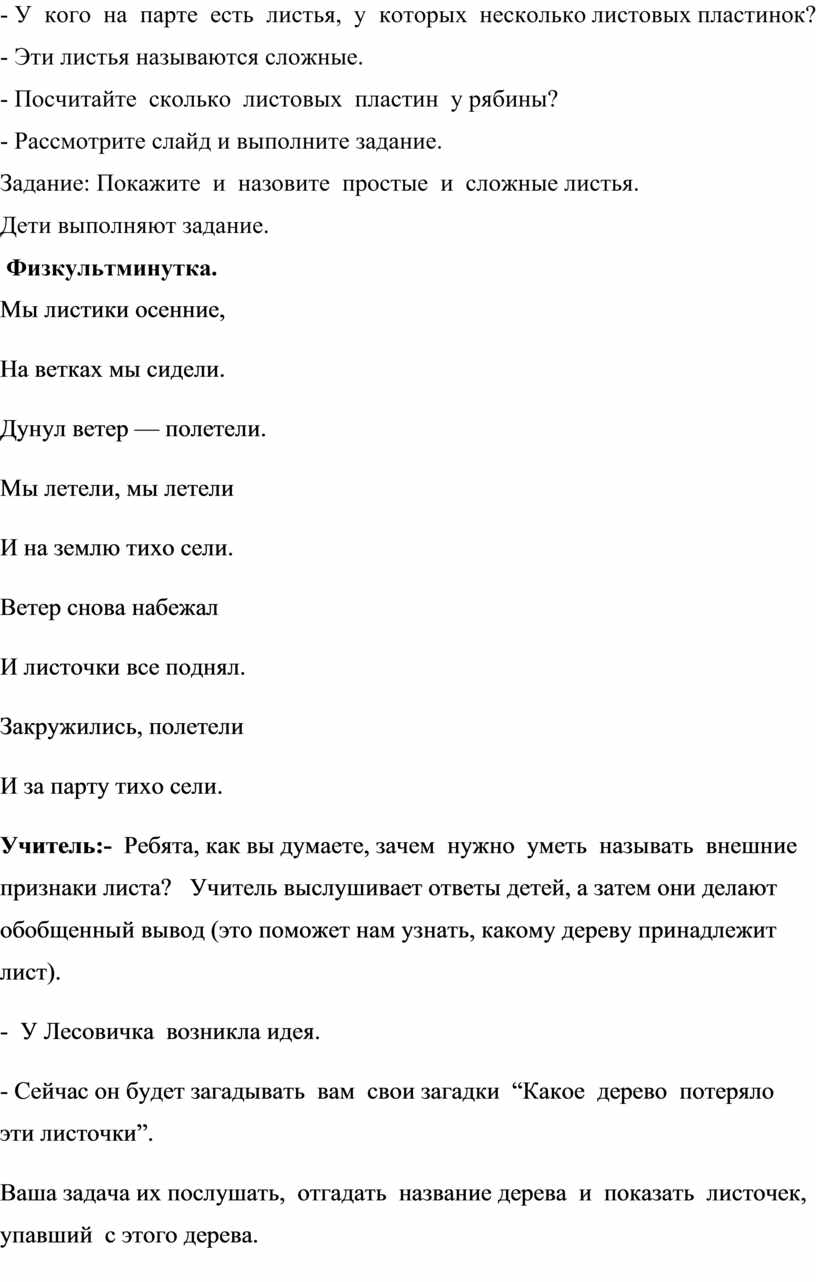 Учитель:- Ребята, как вы думаете, зачем нужно уметь называть внешние признаки листа? Учитель выслушивает ответы детей, а затем они делают обобщенный вывод (это поможет нам узнать, какому дереву принадлежит лист).