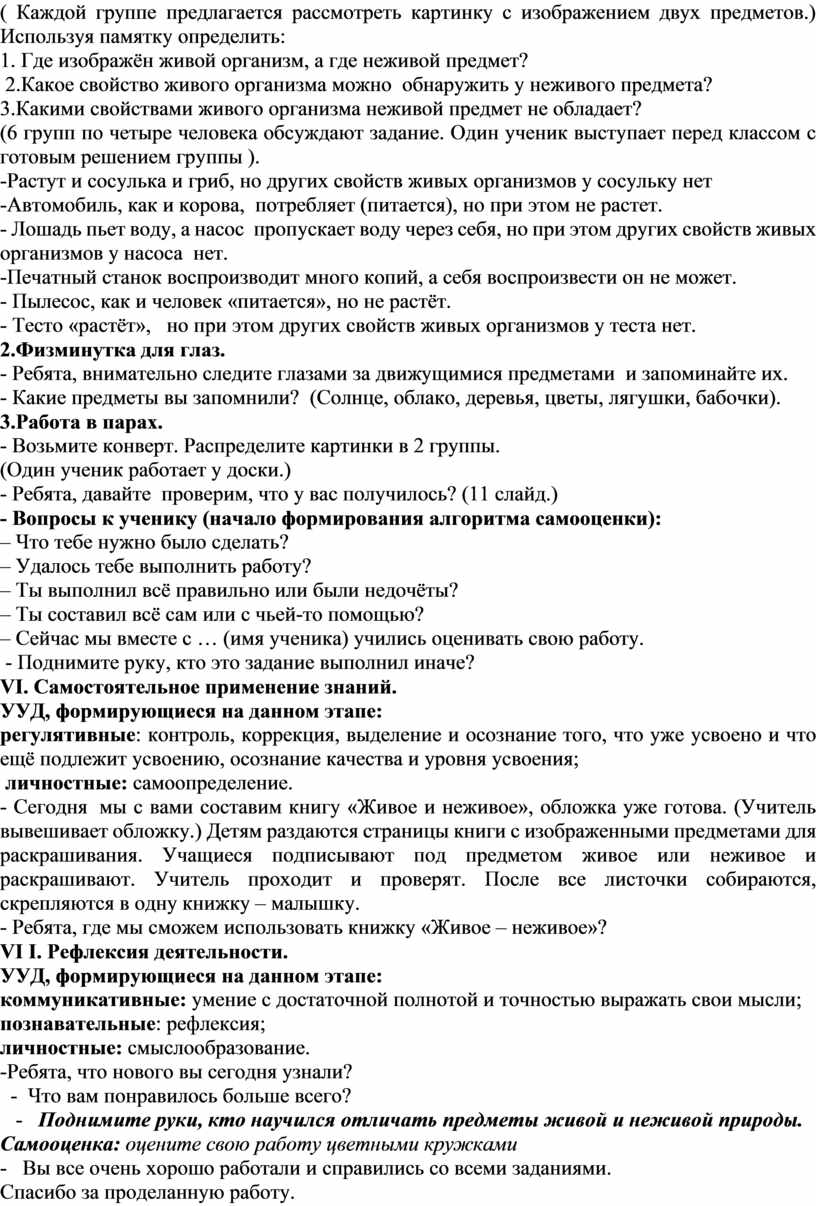 - Сегодня мы с вами составим книгу «Живое и неживое», обложка уже готова. (Учитель вывешивает обложку.) Детям раздаются страницы книги с изображенными предметами для раскрашивания. Учащиеся подписывают под предметом живое или неживое и раскрашивают. Учитель проходит и проверят. После все листочки собираются, скрепляются в одну книжку – малышку.