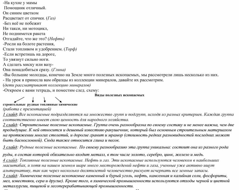-Правильно, Геолог. Геологи- это люди, которые ищут природные богатства и изучают их. Прежде, чем отправиться за природными богатствами, геологам надо провести предварительные изыскания. -Давайте отгадаем загадки, для того чтобы познакомиться, какие есть полезные ископаемык: -Этот мастер белый-белый В школе не лежит без дела: Пробегает по доске, Оставляет белый след. (Мел) -Он очень нужен детворе Он на дорожках во дворе, Он и на стройке, и на пляже Помощник отличный. Он синим цветком Расцветает от спички. (Газ) -Без неё не побежит Ни такси, ни мотоцикл, Не поднимется ракета Отгадайте, что же это? (Нефть) -Росли на болоте растения, Стали топливом и удобрением. (Торф) -Если встретишь на дороге, То увязнут сильно ноги. А сделать миску или вазу- Она понадобиться сразу. (Глина) -Вы большие молодцы, конечно на Земле много полезных ископаемых, мы рассмотрели лишь несколько из них. - На урок я принесла вам образцы из коллекции минералов, давайте их рассмотрим. (дети рассматривают коллекцию минералов) -Откроем с вами тетрадь, и поместим след. схему: Виды полезных ископаемых
