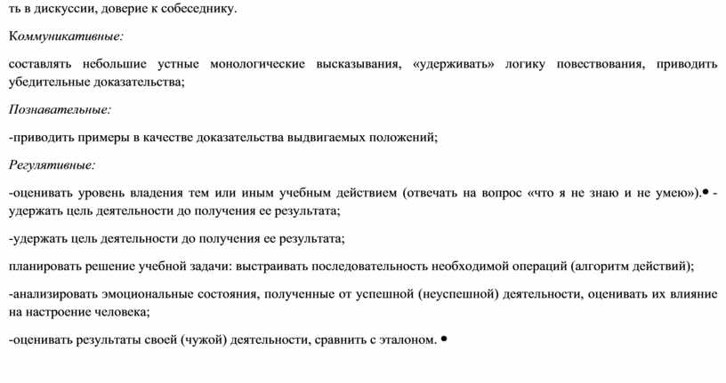 Личностные: -оценивать собственную учебную деятельность: свои достижения, самостоятельность, инициативу, ответственность, причины неудач; -применять правила делового сотрудничества: сравнивать разные точки зрения; считаться с мнением другого человека; проявлять терпение и доброжелательность в дискуссии, доверие к собеседнику. Коммуникативные: составлять небольшие устные монологические высказывания, «удерживать» логику повествования, приводить убедительные доказательства; Познавательные: -приводить примеры в качестве доказательства выдвигаемых положений; Регулятивные: -оценивать уровень владения тем или иным учебным действием (отвечать на вопрос «что я не знаю и не умею»). |