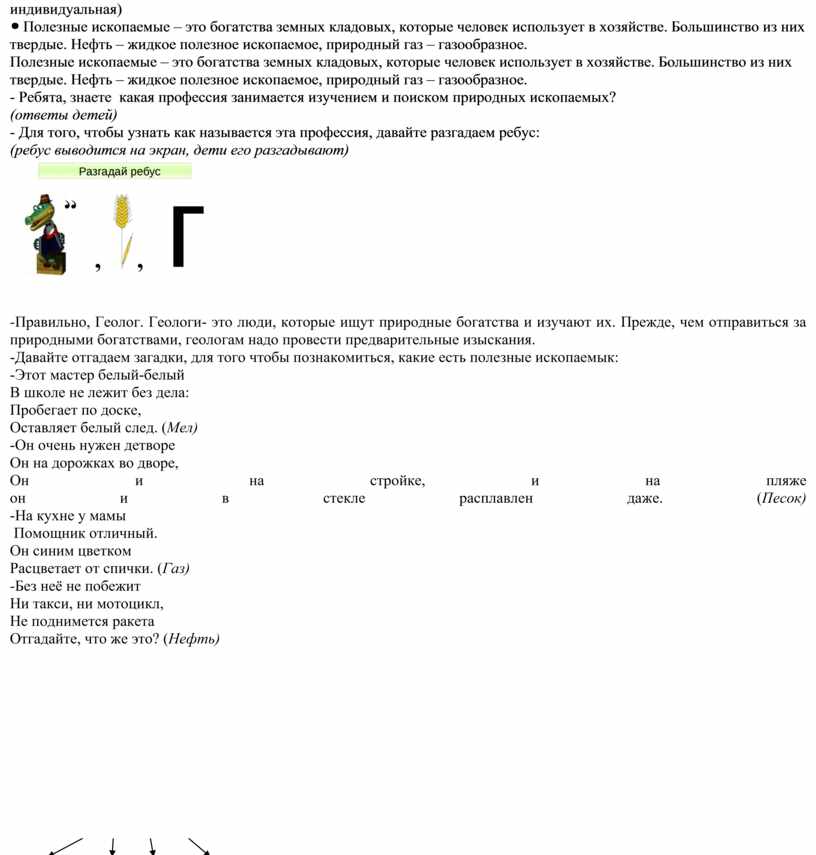 Полезные ископаемые – это богатства земных кладовых, которые человек использует в хозяйстве. Большинство из них твердые. Нефть – жидкое полезное ископаемое, природный газ – газообразное. - Ребята, знаете какая профессия занимается изучением и поиском природных ископаемых? (ответы детей) - Для того, чтобы узнать как называется эта профессия, давайте разгадаем ребус: (ребус выводится на экран, дети его разгадывают)