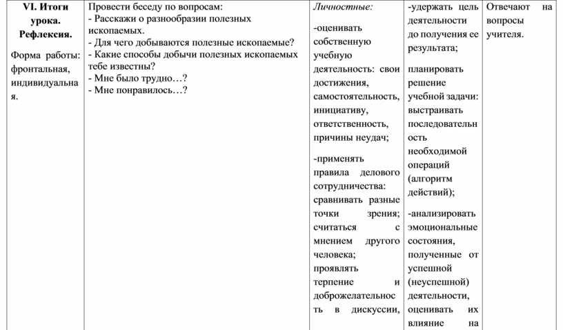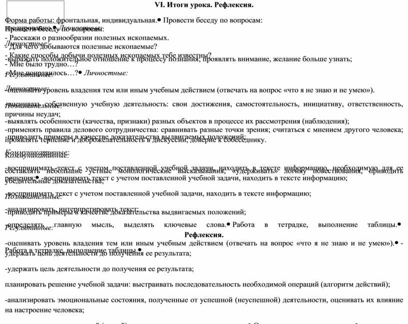 VI. Итоги урока. Рефлексия. Форма работы: фронтальная, индивидуальная. |