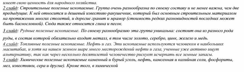 строительные рудные топливные химические (работа с презентацией) 1 слайд: Все ископаемые подразделяются на множество групп и подгрупп, исходя из разных критериев. Каждая группа соответственно имеет свою ценность для народного хозяйства. 2 слайд: Строительные полезные ископаемые. Группа очень разнообразна по своему составу и не менее важна, чем две предыдущие. К ней относится и дешевый известняк-ракушечник, который был основным строительным материалом на протяжении многих столетий, и дорогие гранит и мрамор (стоимость редких разновидностей последних может быть баснословной). Сюда также относится глина и песок. 3 слайд: Рудные полезные ископаемые. По своему разнообразию эта группа уникальна: состоит она из разного рода руды, в состав которой обязательно входит металл, в том числе золото, серебро, цинк, железо и медь. 4 слайд: Топливные полезные ископаемые. Нефть и газ. Эти ископаемые используются человеком в наибольших масштабах, и хотя на нашем земном шаре много месторождений нефти и газа, ученные уже активно ищут альтернативу, так как через несколько десятилетий человечество рискует исчерпать все земные запасы. 5 слайд: Химические полезные ископаемые каменный и бурый уголь, нефть, камсенная и калийная соли, фосфориты, мел, известняки, сера и другие). Кроме того, в химической промышленности используются отходы черной и цветной металлургии, пищевой и лесоперерабатывающей промышленности. -Изучая полезные ископаемые, отыскивают месторождения геологи. Нередко они по многу месяцев проводят вдали от дома: в тайге, в горах, в пустынях. У геологов есть сложная аппаратура, вертолеты, вездеходы, радиосвязь и фотографии Земли, сделанные из космоса. -Полезные ископаемые добывают по-разному: одни - в открытых