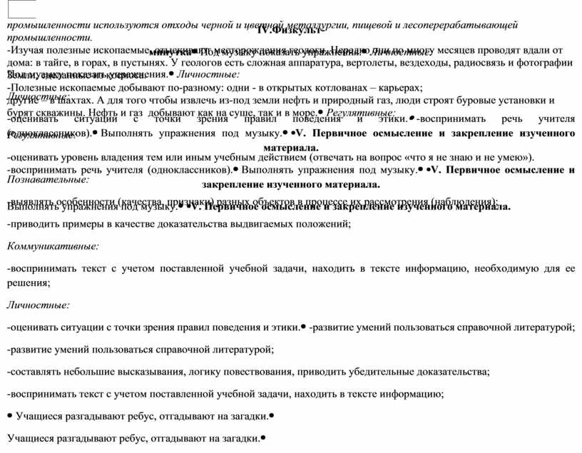 2. Продолжить формирование специальных учебных действий – умений работать с натуральными объектами – образцы полезных ископаемых; интеллектуально-познавательных УУД: сравнивать, анализировать, обобщать, делать выводы; коммуникативных: уметь воспринимать текст с учетом учебной задачи, оформлять свои мысли в устной форме; регулятивных: оценивать свою деятельность и уметь ее корректировать.