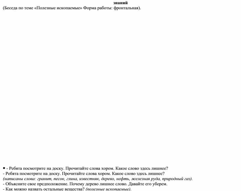 II. Актуализация знаний (Беседа по теме «Полезные ископаемые» Форма работы: фронтальная).