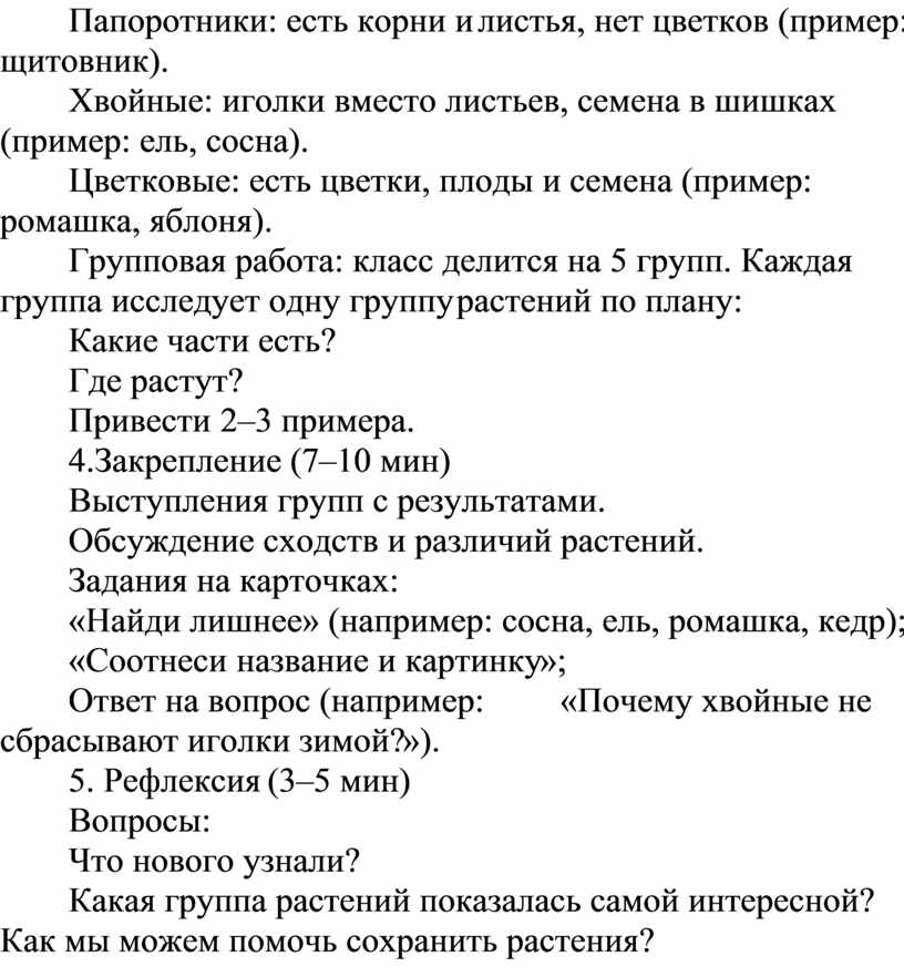 Групповая работа: класс делится на 5 групп. Каждая группа исследует одну группу растений по плану: