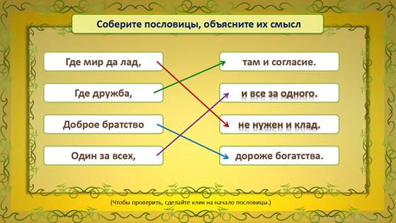 Сейчас, давайте с вами попробуем собрать пословицы и объяснить их смысл.
