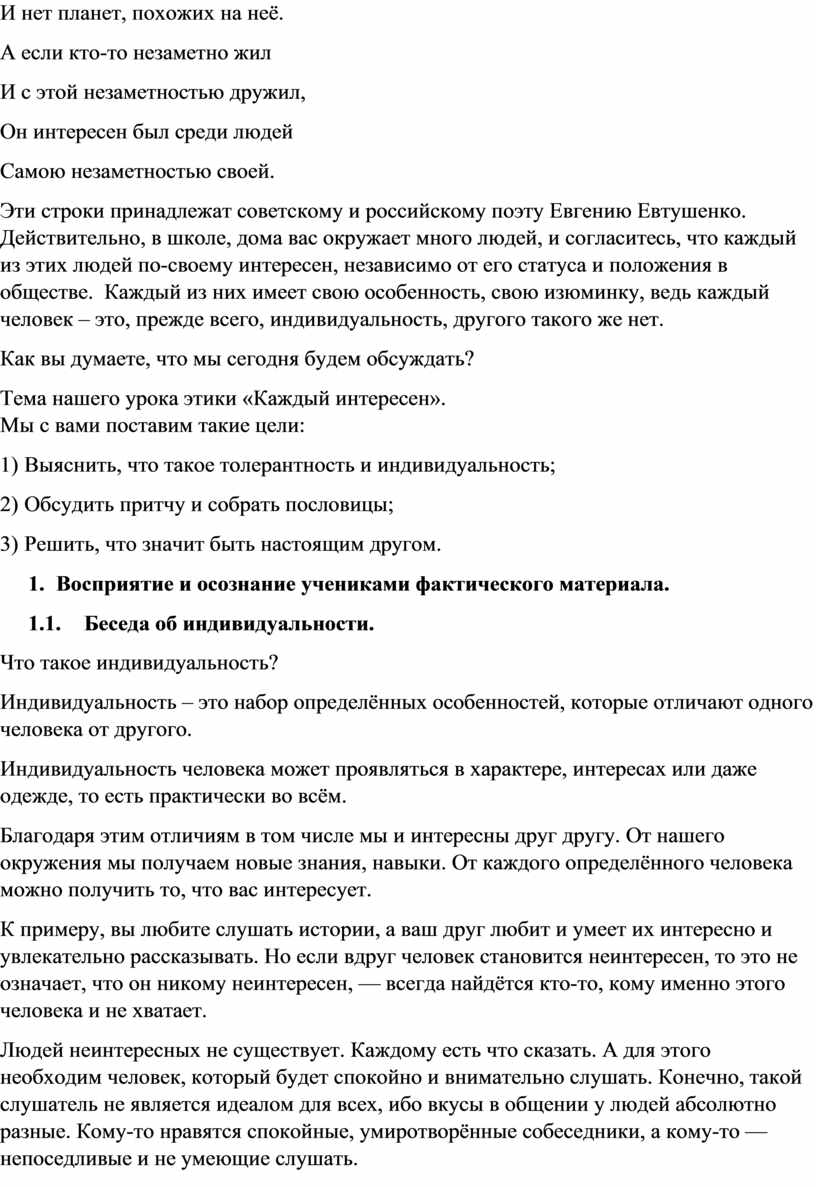 Эти строки принадлежат советскому и российскому поэту Евгению Евтушенко. Действительно, в школе, дома вас окружает много людей, и согласитесь, что каждый из этих людей по-своему интересен, независимо от его статуса и положения в обществе. Каждый из них имеет свою особенность, свою изюминку, ведь каждый человек – это, прежде всего, индивидуальность, другого такого же нет.