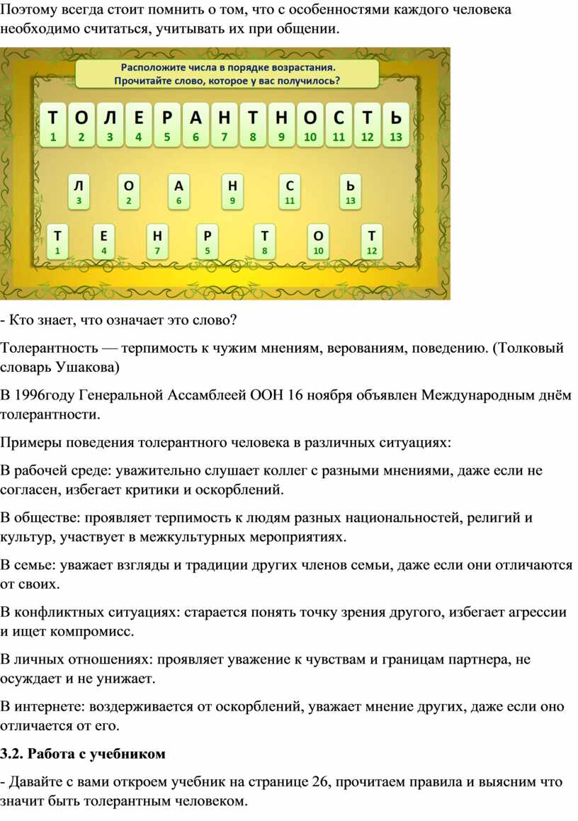 - Давайте с вами откроем учебник на странице 26, прочитаем правила и выясним что значит быть толерантным человеком.