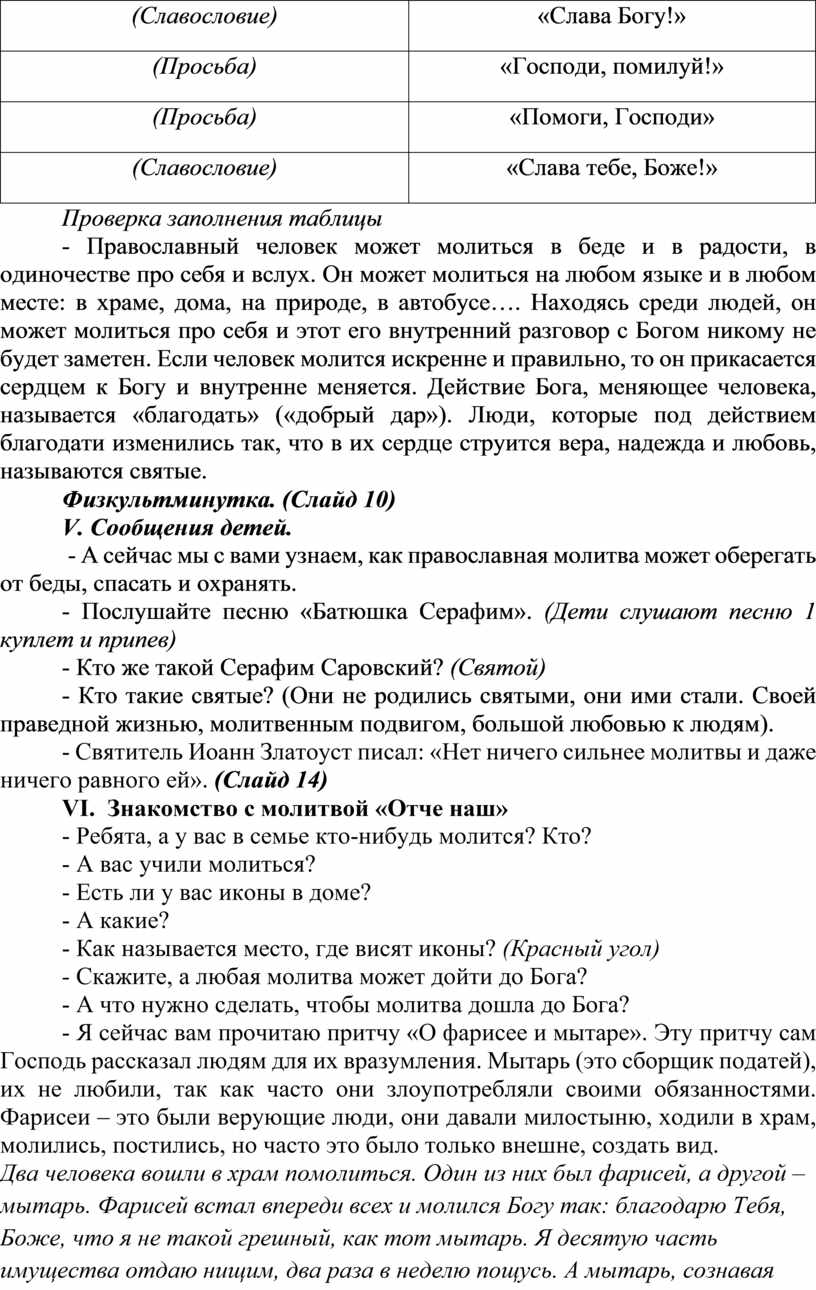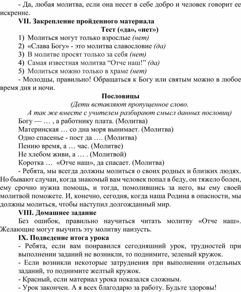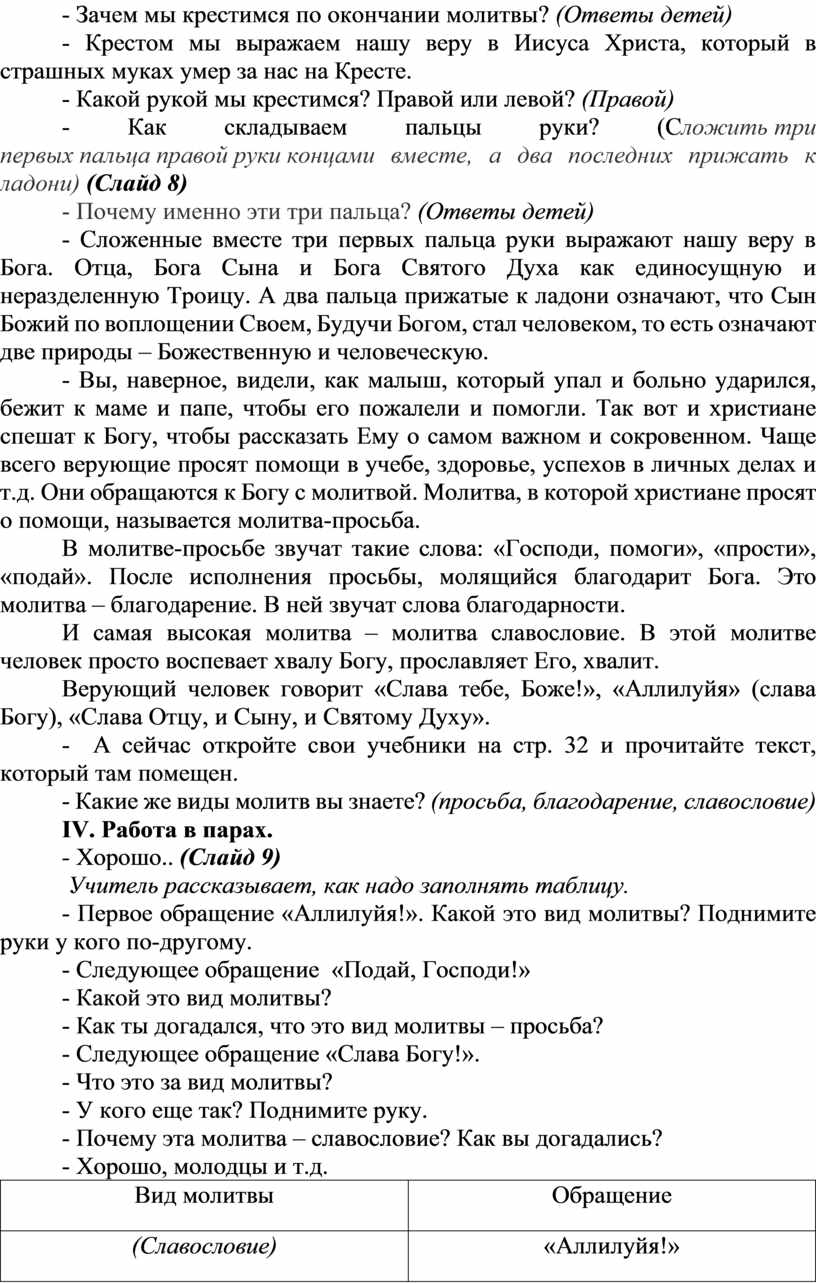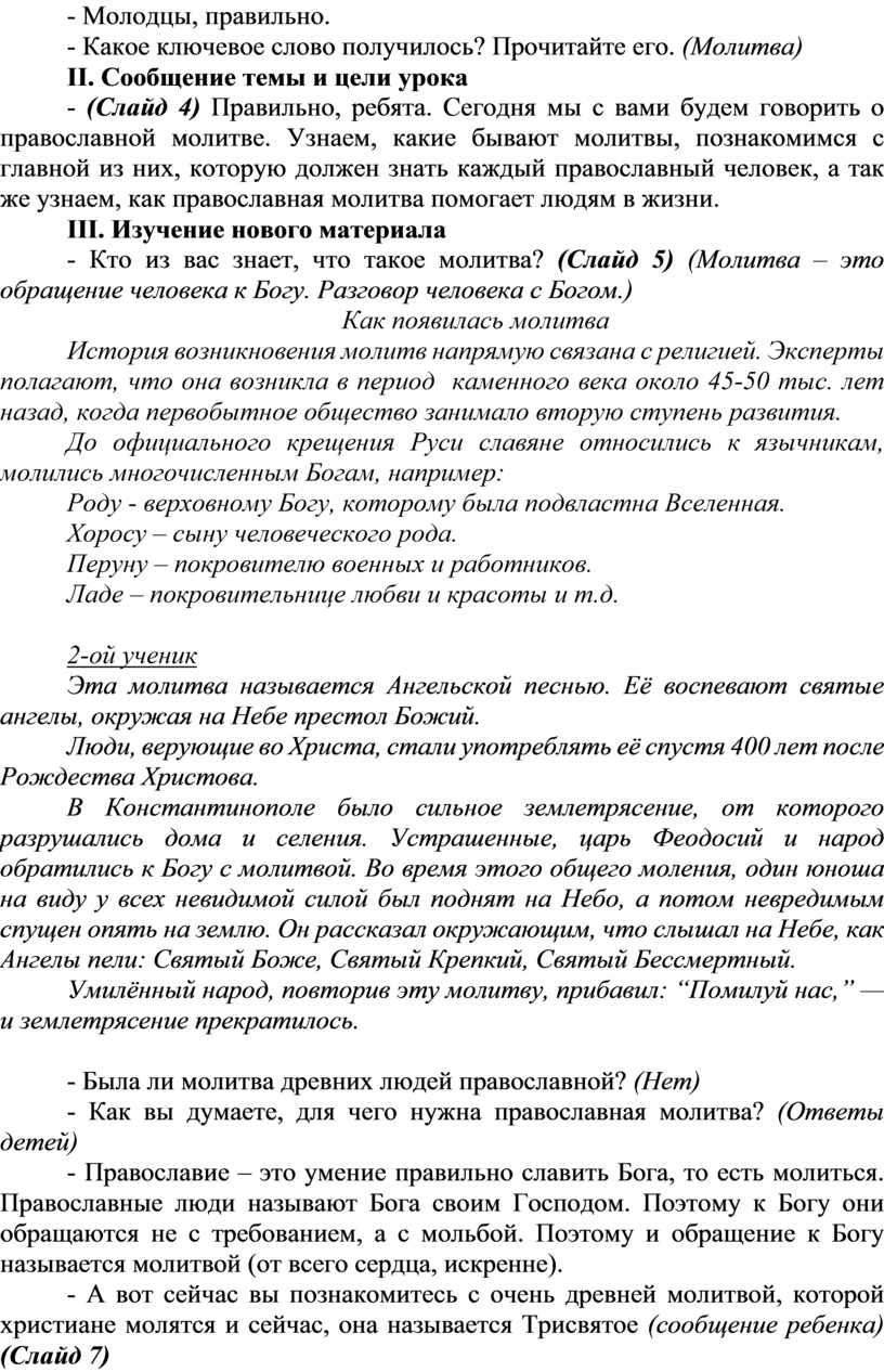 Цель: помочь обучающимся осмыслить понятие «молитва, как разговора человека с Богом, форму возможного общения с Богом».