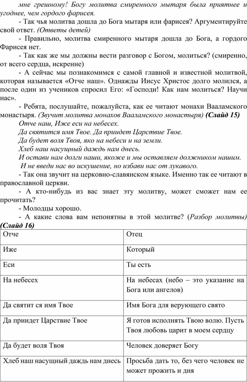 - А сейчас мы познакомимся с самой главной и известной молитвой, которая называется «Отче наш». Однажды Иисус Христос долго молился, а после один из учеников спросил Его: «Господи! Как нам молиться? Научи нас».