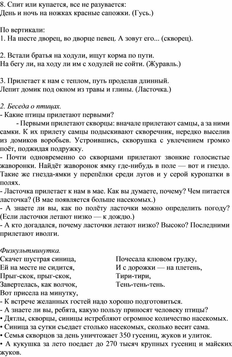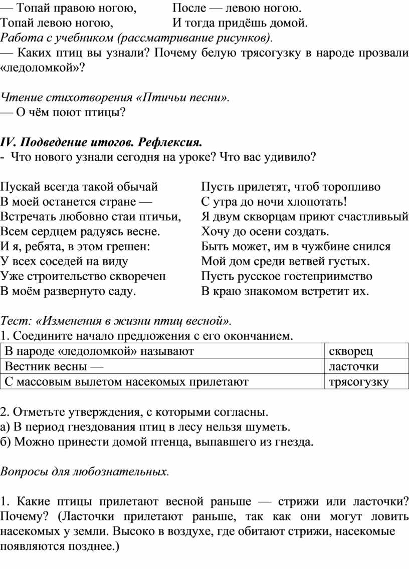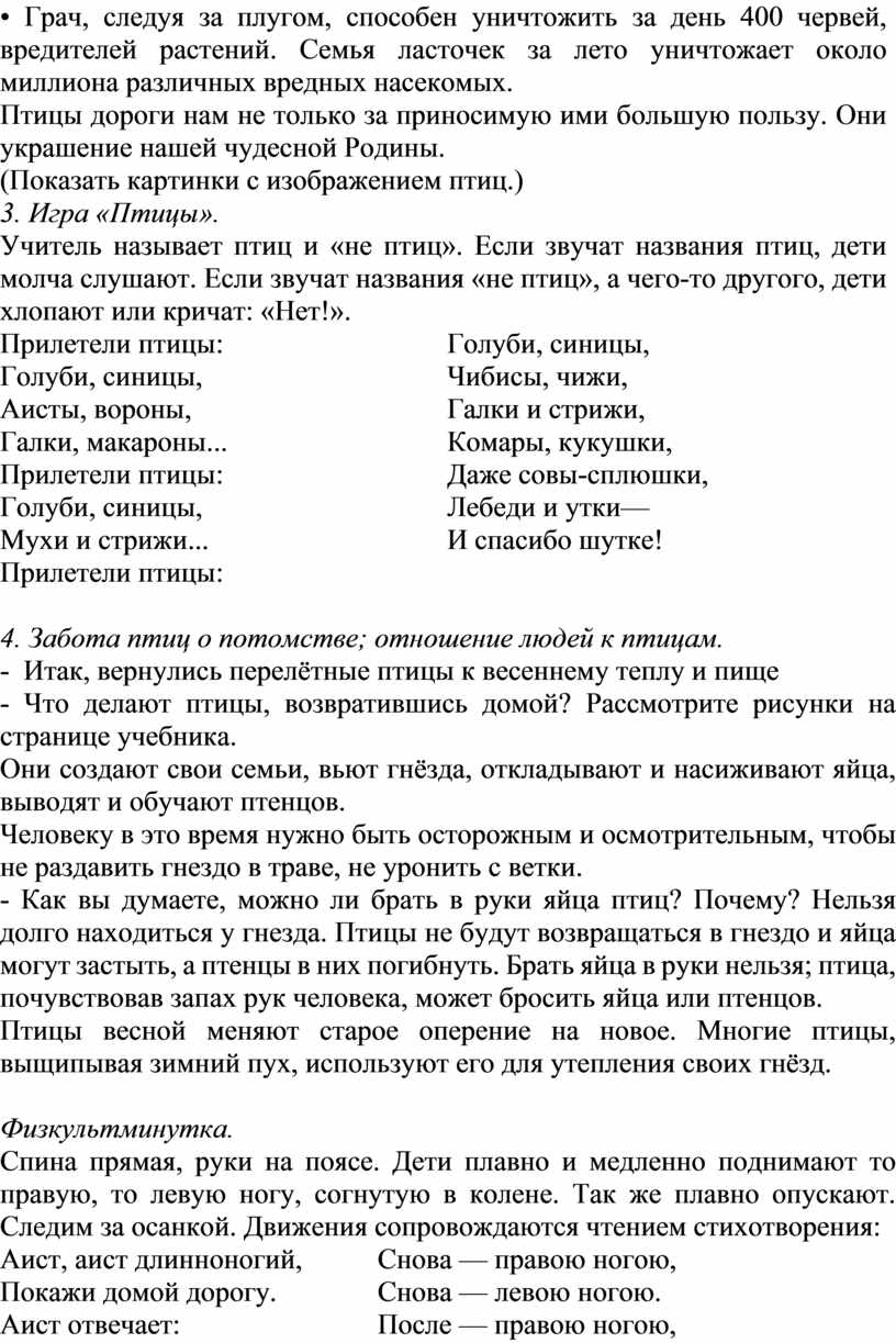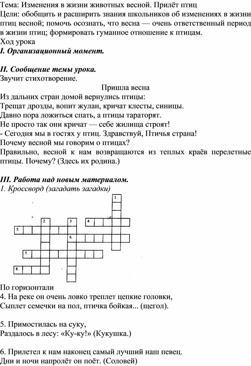 Цели: обобщить и расширить знания школьников об изменениях в жизни птиц весной; помочь осознать, что весна — очень ответственный период в жизни птиц; формировать гуманное отношение к птицам.