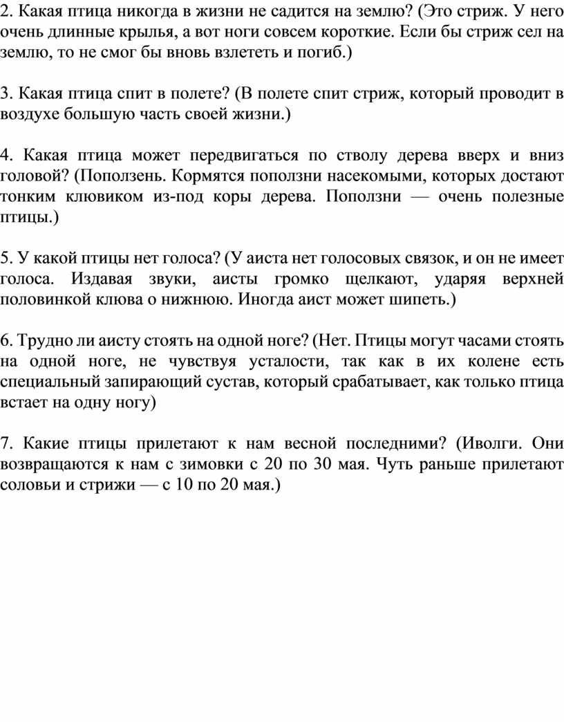 7. Какие птицы прилетают к нам весной последними? (Иволги. Они возвращаются к нам с зимовки с 20 по 30 мая. Чуть раньше прилетают соловьи и стрижи — с 10 по 20 мая.)