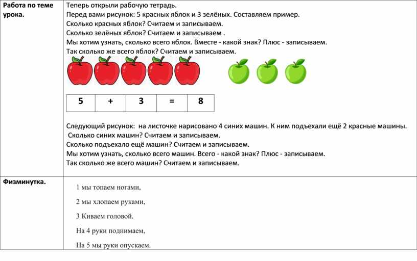Теперь открыли рабочую тетрадь. Перед вами рисунок: 5 красных яблок и 3 зелёных. Составляем пример. Сколько красных яблок? Считаем и записываем. Сколько зелёных яблок? Считаем и записываем . Мы хотим узнать, сколько всего яблок. Вместе - какой знак? Плюс - записываем. Так сколько же всего яблок? Считаем и записываем.