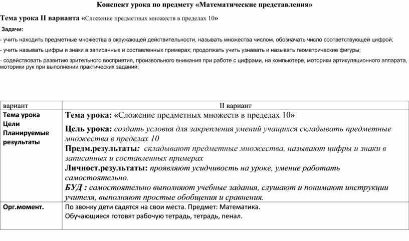 Тема урока II варианта «Сложение предметных множеств в пределах 10»