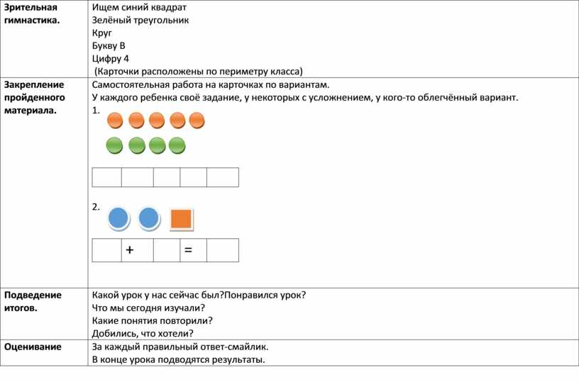 Тема урока: «Сложение предметных множеств в пределах 10» Цель урока: создать условия для закрепления умений учащихся складывать предметные множества в пределах 10 Предм.результаты: складывают предметные множества, называют цифры и знаки в записанных и составленных примерах Личност.результаты: проявляют усидчивость на уроке, умение работать самостоятельно. БУД : самостоятельно выполняют учебные задания, слушают и понимают инструкции учителя, выполняют простые обобщения и сравнения. |