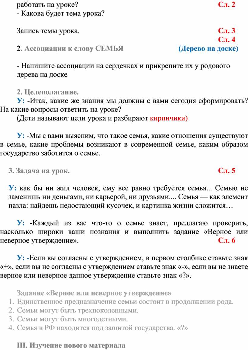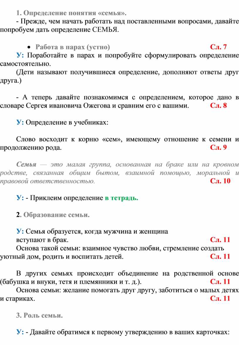 У: -Мы с вами выясним, что такое семья, какие отношения существуют в семье, какие проблемы возникают в современной семье, каким образом государство заботится о семье.