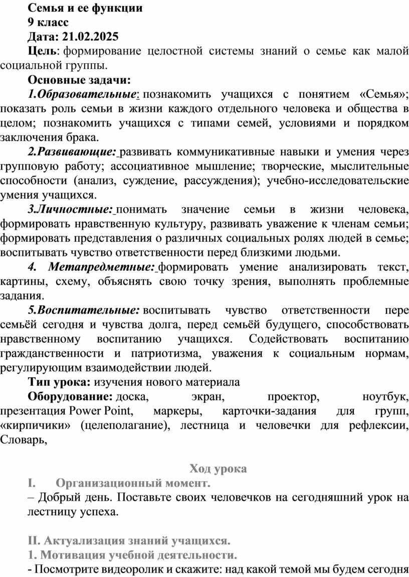 1.Образовательные: познакомить учащихся с понятием «Семья»; показать роль семьи в жизни каждого отдельного человека и общества в целом; познакомить учащихся с типами семей, условиями и порядком заключения брака.