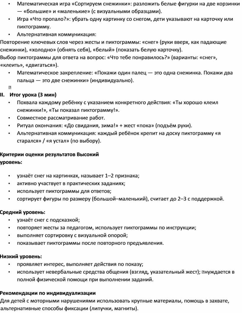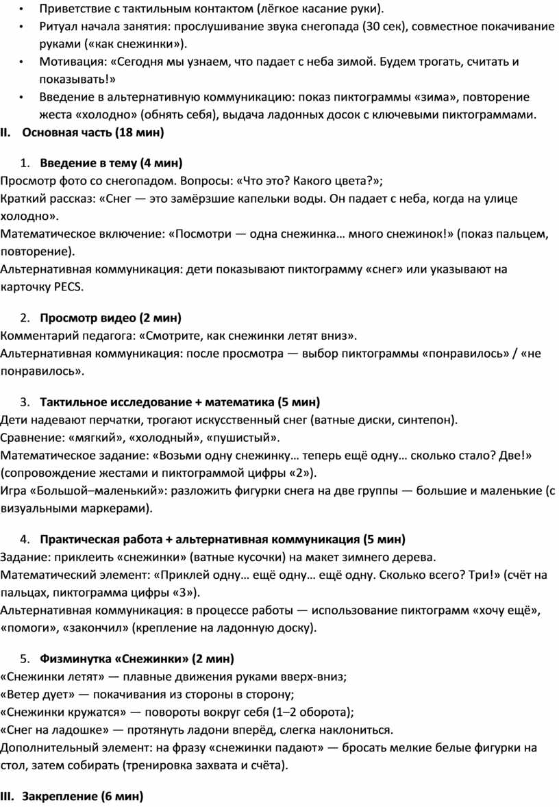 Цель:сформировать элементарное представление о снегопаде как зимнем природном явлении через сенсорное восприятие, практическую деятельность, математические операции и средства альтернативной коммуникации.