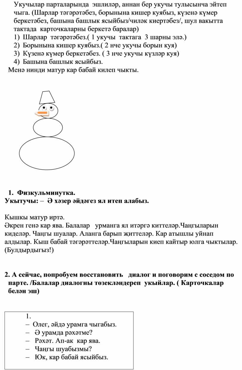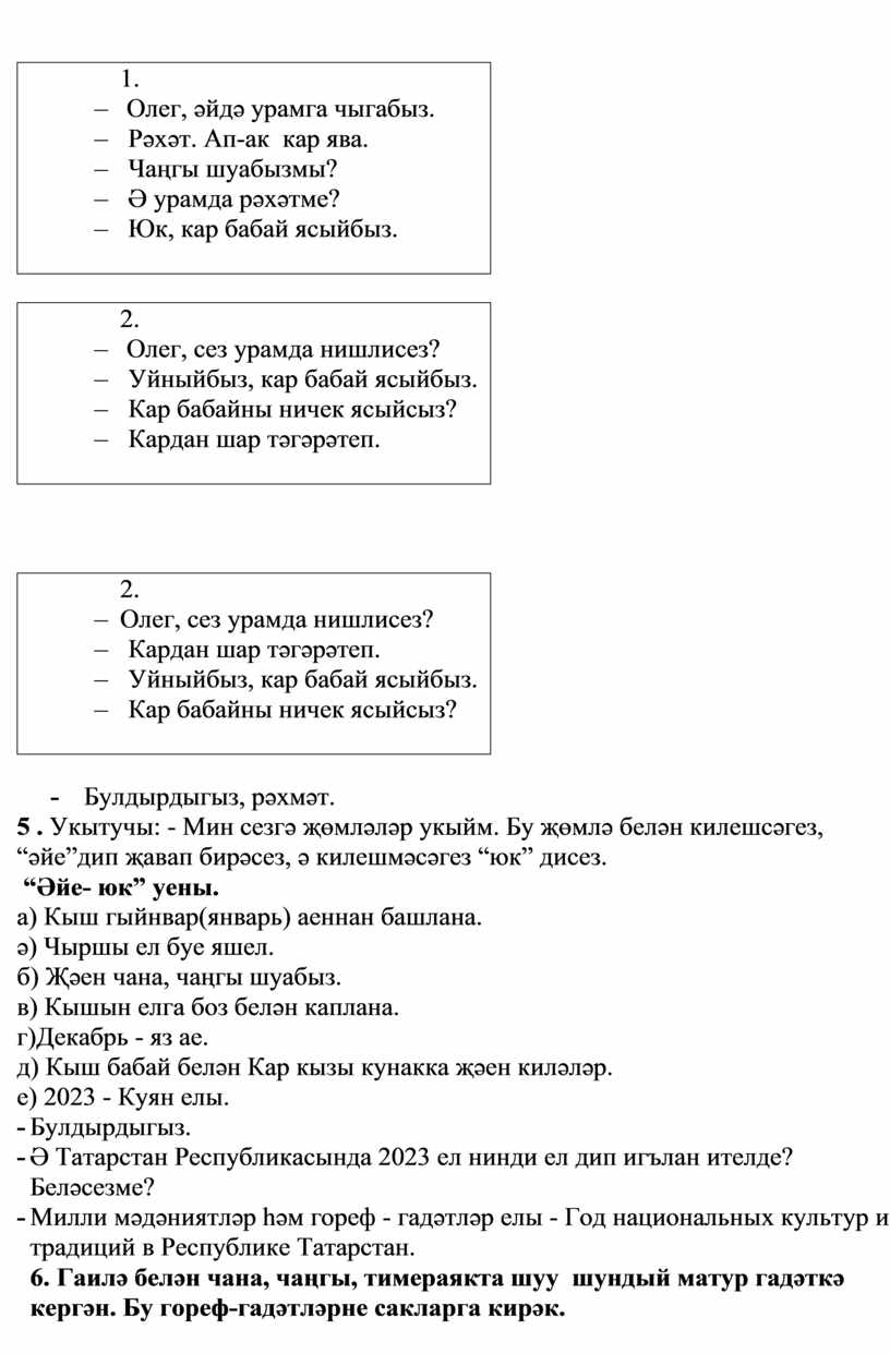1. – Олег, әйдә урамга чыгабыз. – Ә урамда рәхәтме? – Рәхәт. Ап-ак кар ява. – Чаңгы шуабызмы? – Юк, кар бабай ясыйбыз.