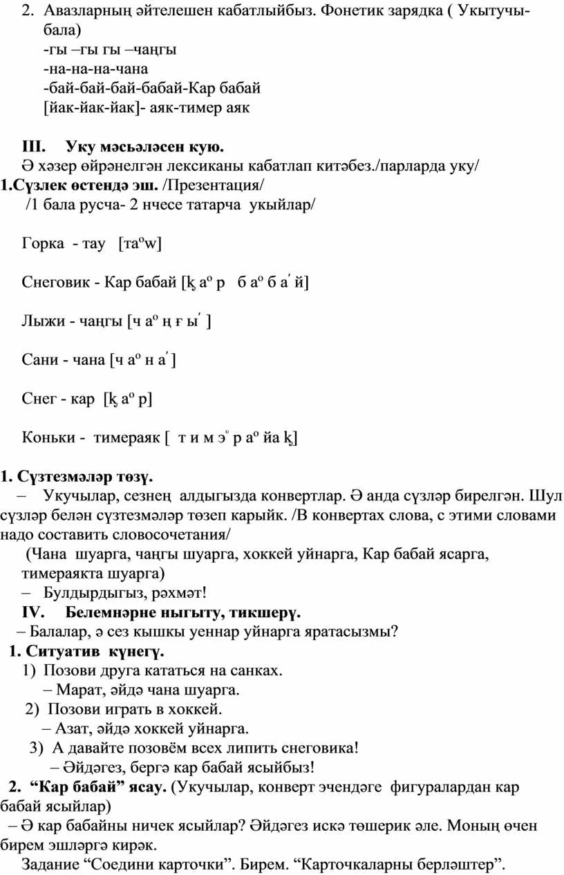 2. – Олег, сез урамда нишлисез? – Уйныйбыз, кар бабай ясыйбыз. – Кар бабайны ничек ясыйсыз? – Кардан шар тәгәрәтеп.