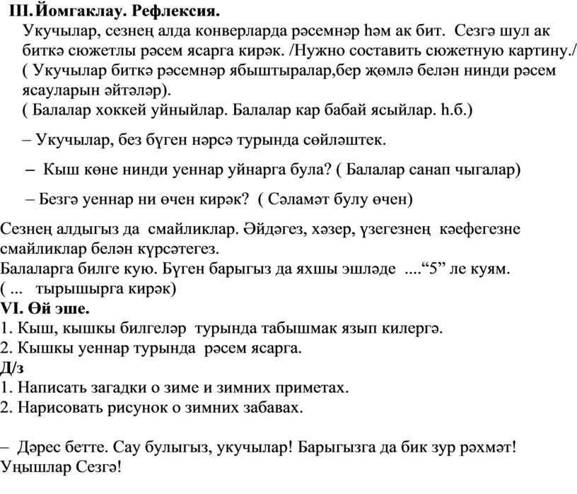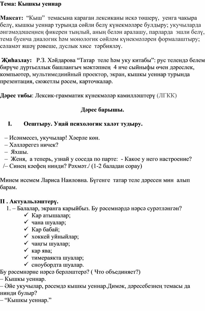 Җиһазлау: Р.З. Хәйдарова “Татар теле һәм уку китабы”: рус телендә белем бирүче дүртьеллык башлангыч мәктәпнең 4 нче сыйныфы өчен дәреслек, компьютер, мультимедиийный проектор, экран, кышкы уеннар турында презентация, сюжетлы рәсем, карточкалар.