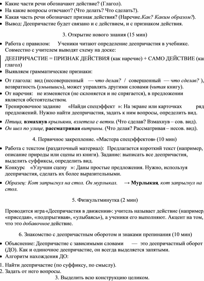· Формулировка темы: Учитель объявляет тему: «Деепричастия: “речевые спецэффекты” для описания действий». Объясняет метафору: как в кино спецэффекты делают картинку ярче, так и деепричастия «оживляют» текст, показывая сразу два действия.
