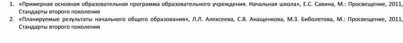 4. «Примерная основная образовательная программа образовательного учреждения. Начальная школа», Е.С. Савина, М.: Просвещение, 2011, Стандарты второго поколения