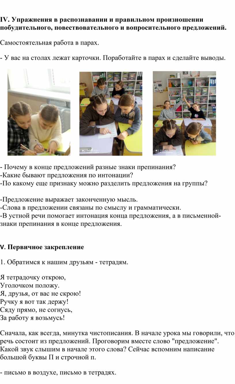 IV. Упражнения в распознавании и правильном произношении побудительного, повествовательного и вопросительного предложений.