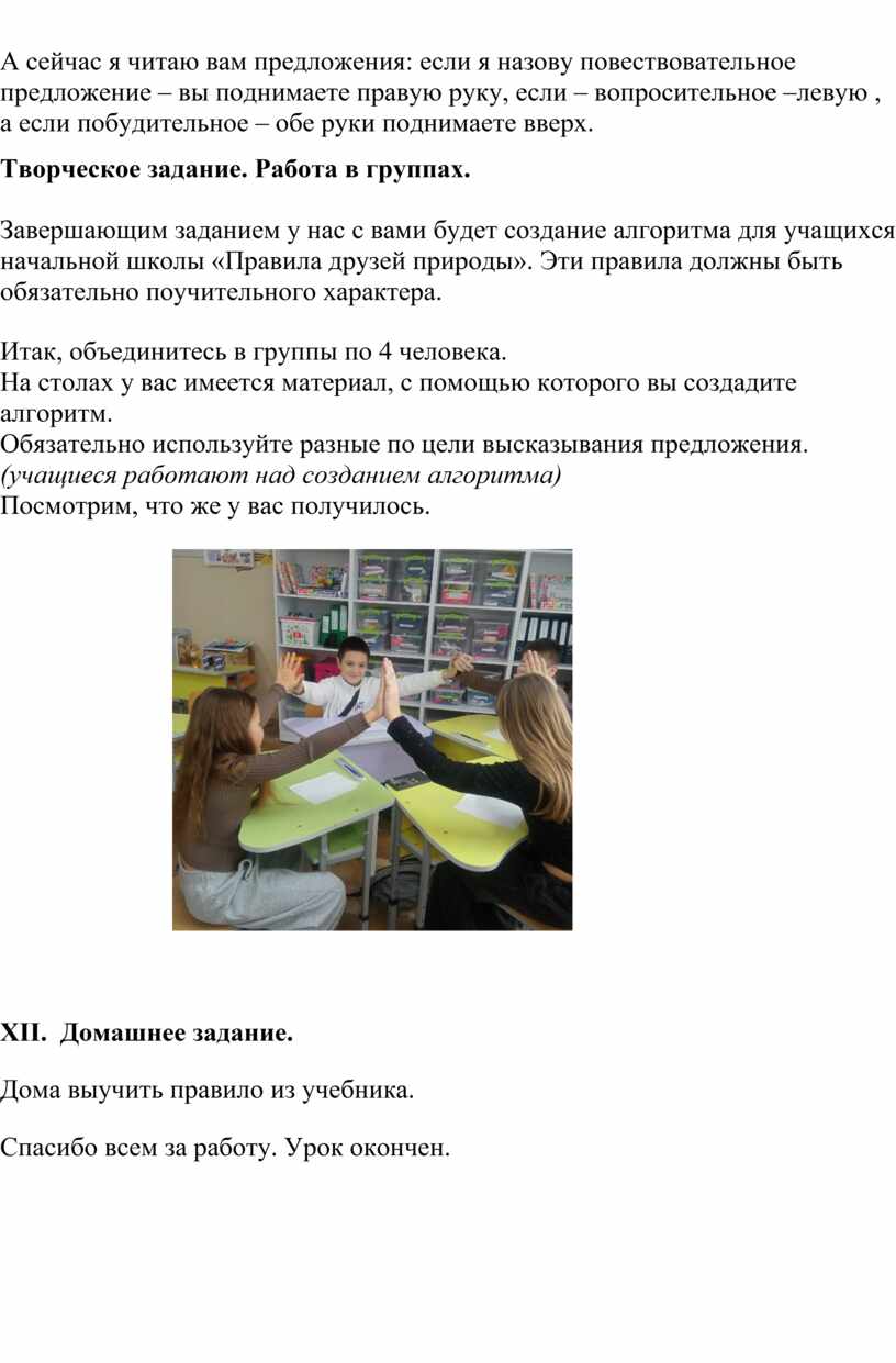 А сейчас я читаю вам предложения: если я назову повествовательное предложение – вы поднимаете правую руку, если – вопросительное –левую , а если побудительное – обе руки поднимаете вверх.