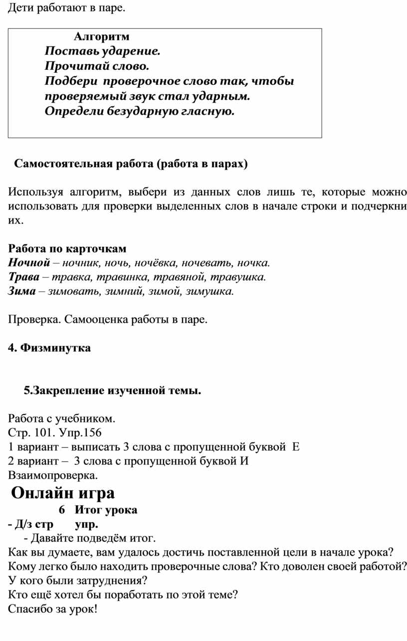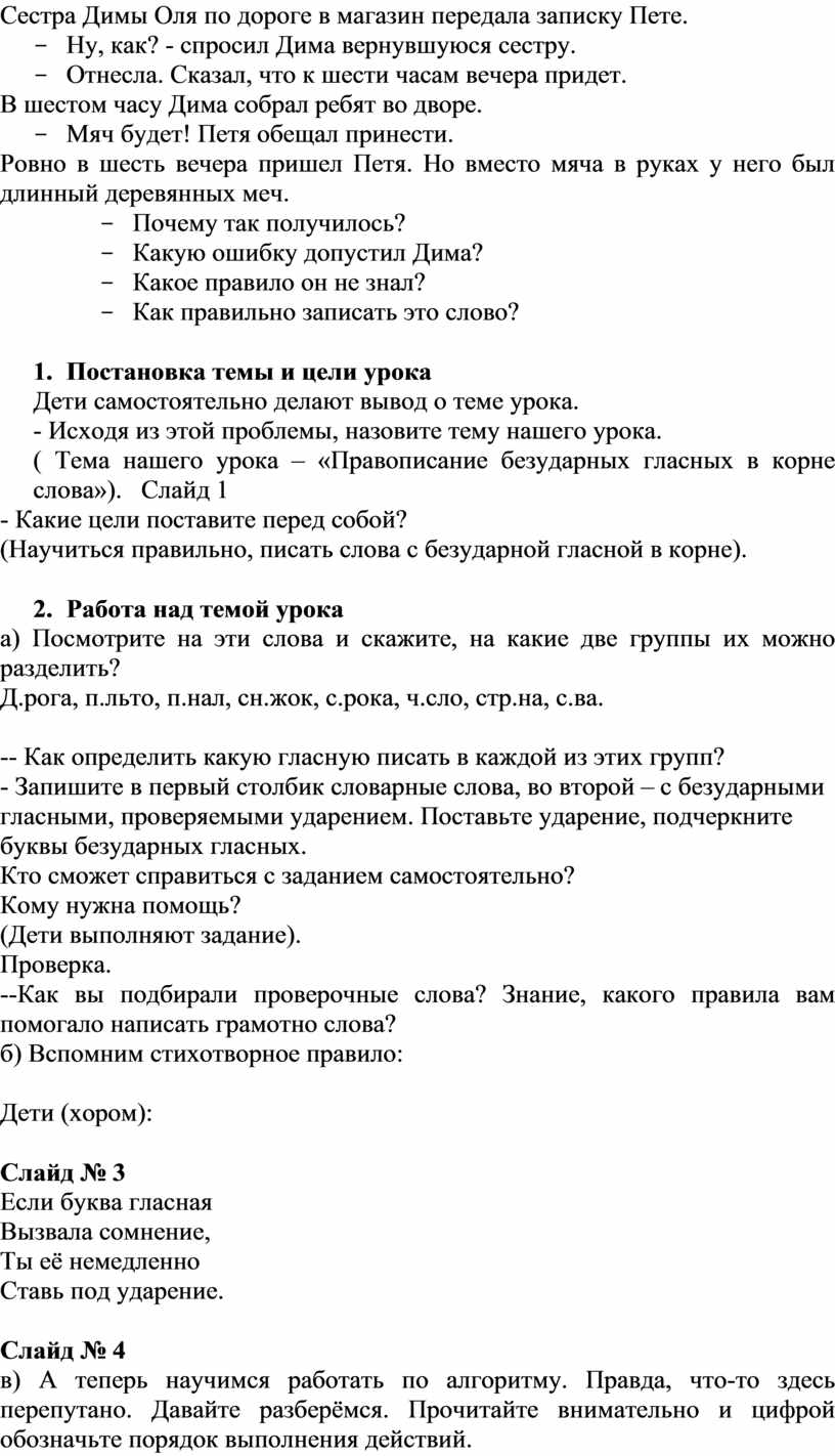 \амотного письма и отработка умений подбирать проверочные слова, используя алгоритм проверки безударных гласных в корне слов
