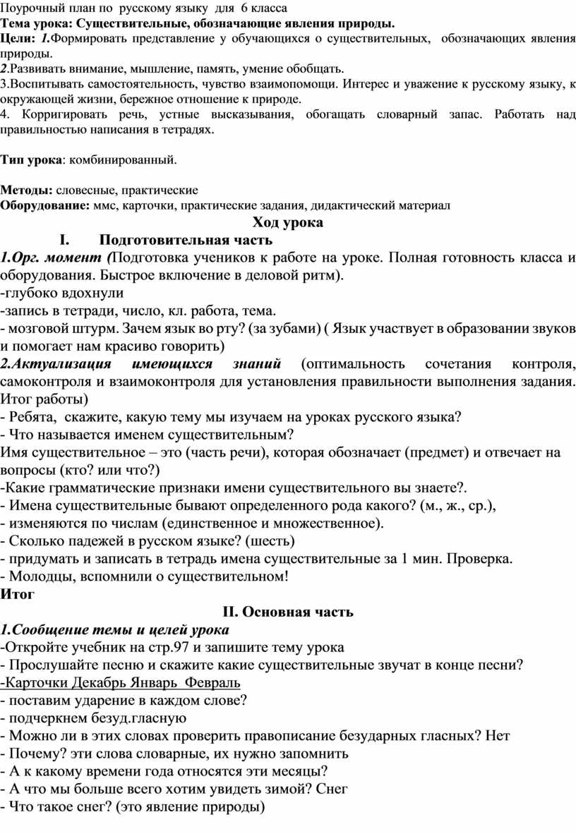 Поурочный план по русскому языку для 6 класса