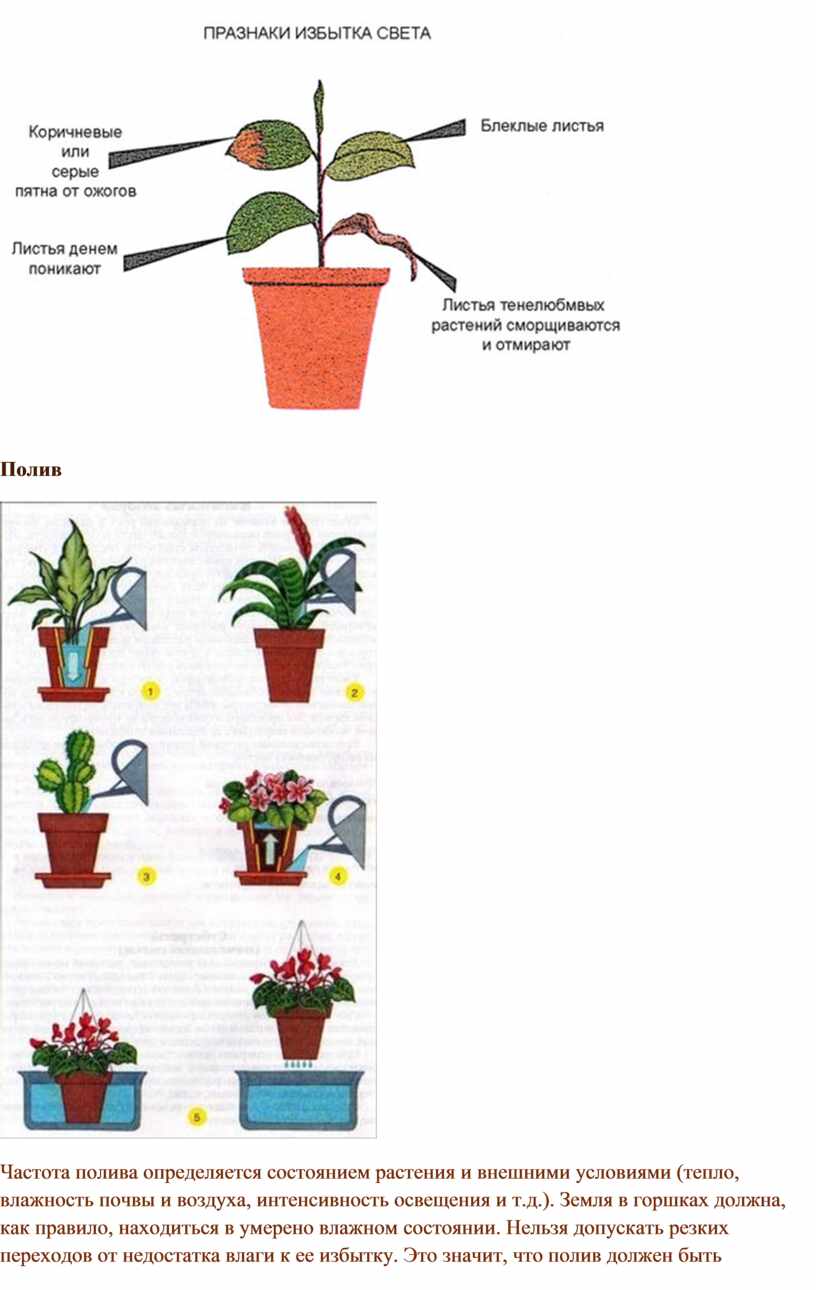 Частота полива определяется состоянием растения и внешними условиями (тепло, влажность почвы и воздуха, интенсивность освещения и т.д.). Земля в горшках должна, как правило, находиться в умерено влажном состоянии. Нельзя допускать резких переходов от недостатка влаги к ее избытку. Это значит, что полив должен быть регулярным и равномерным. Есть золотое правило полива растений - лучше поливать меньше, но чаще, чем реже и помногу.