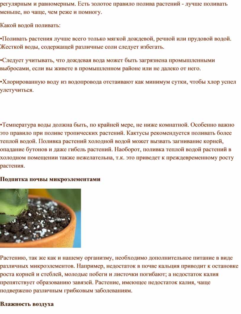 •Поливать растения лучше всего только мягкой дождевой, речной или прудовой водой. Жесткой воды, содержащей различные соли следует избегать.