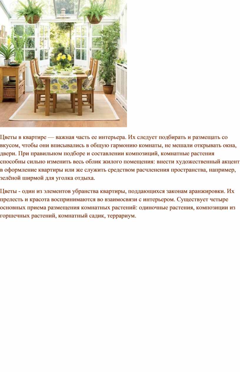 Цветы в квартире — важная часть ее интерьера. Их следует подбирать и размещать со вкусом, чтобы они вписывались в общую гармонию комнаты, не мешали открывать окна, двери. При правильном подборе и составлении композиций, комнатные растения способны сильно изменить весь облик жилого помещения: внести художественный акцент в оформление квартиры или же служить средством расчленения пространства, например, зелёной ширмой для уголка отдыха.