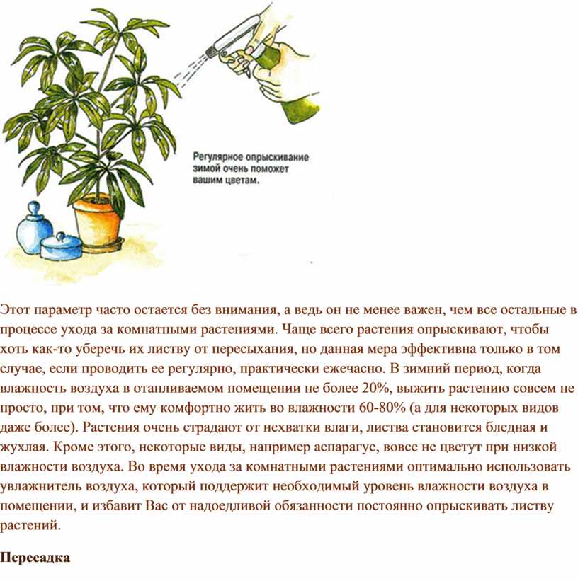 Этот параметр часто остается без внимания, а ведь он не менее важен, чем все остальные в процессе ухода за комнатными растениями. Чаще всего растения опрыскивают, чтобы хоть как-то уберечь их листву от пересыхания, но данная мера эффективна только в том случае, если проводить ее регулярно, практически ежечасно. В зимний период, когда влажность воздуха в отапливаемом помещении не более 20%, выжить растению совсем не просто, при том, что ему комфортно жить во влажности 60-80% (а для некоторых видов даже более). Растения очень страдают от нехватки влаги, листва становится бледная и жухлая. Кроме этого, некоторые виды, например аспарагус, вовсе не цветут при низкой влажности воздуха. Во время ухода за комнатными растениями оптимально использовать увлажнитель воздуха, который поддержит необходимый уровень влажности воздуха в помещении, и избавит Вас от надоедливой обязанности постоянно опрыскивать листву растений.