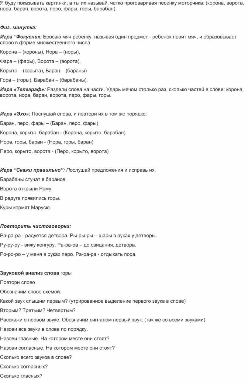 Я буду показывать картинки, а ты их называй, четко проговаривая песенку моторчика: (корона, ворота, нора, баран, ворота, перо, фары, горы, барабан)