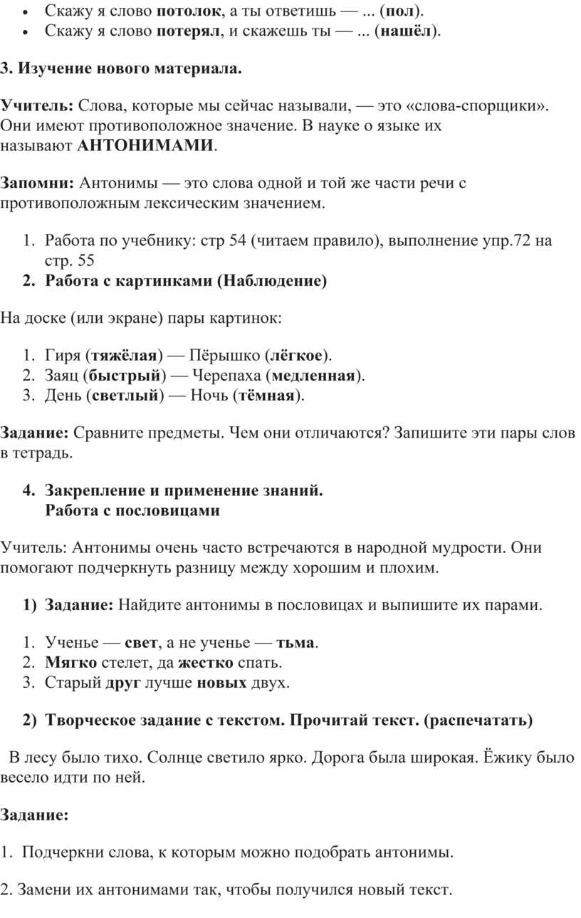 Цель урока: Познакомить учащихся с понятием «антонимы», научить находить их в тексте и использовать в речи.