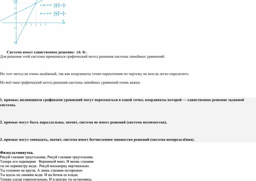 Но этот метод не очень надёжный, так как координаты точки пересечения по чертежу не всегда легко определить. Но всё-таки графический метод решения системы линейных уравнений очень важен.