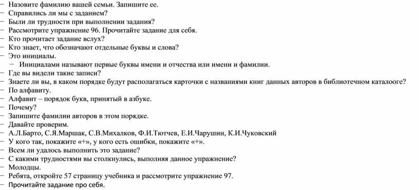 − Что мы должны выполнить на данном этапе? − Откройте учебник на странице 55. − Рассмотрите упражнение 94. − Прочитайте задание для себя. − Кто прочитает вслух? − Можно ли по отчеству человека узнать, как зовут его отца? − Почему? − Отчество дается по имени отца. − Вспомните отчество своей мамы и назовите имя отца. − Скажите товарищу по парте свое отчество, а он назовет имя вашего отца. − Кто правильно ответил покажите знак «+». − Молодцы. − Что мы узнали, выполняя данное упражнение? − физминутка − Давайте выполним 95 упражнение. − Прочитайте для себя. − Кто прочитает вслух? − Какие слова выделены? − Выпишите выделенные слова. − Обозначьте в них ударение. − Фамилия, имя, отчество. − Можно ли назвать выделенные слова собственными именами существительными? Почему? − Эти слова нельзя назвать собственными именами существительными, потому что…. − Назовите фамилию вашей семьи. Запишите ее. − Справились ли мы с заданием? − Были ли трудности при выполнении задания? − Рассмотрите упражнение 96. Прочитайте задание для себя. − Кто прочитает задание вслух? − Кто знает, что обозначают отдельные буквы и слова? − Это инициалы. − Инициалами называют первые буквы имени и отчества или имени и фамилии. − Где вы видели такие записи? − Знаете ли вы, в каком порядке будут располагаться карточки с названиями книг данных авторов в библиотечном каталооге? − По алфавиту. − Алфавит – порядок букв, принятый в азбуке. − Почему? − Запишите фамилии авторов в этом порядке. − Давайте проверим. − А.Л.Барто, С.Я.Маршак, С.В.Михалков, Ф.И.Тютчев, Е.И.Чарушин, К.И.Чуковский − У кого так, покажите «+», у кого есть ошибки, покажите «+». − Всем ли удалось выполнить это задание? − С какими трудностями вы столкнулись, выполняя данное упражнение? − Молодцы. − Ребята, откройте 57 страницу учебника и рассмотрите упражнение 97. − Прочитайте задание про себя. − Что нужно сделать? − Работа по уражнению. − Что мы делали на данном этапе? − Можем ли мы переходить на следующую ступень? |