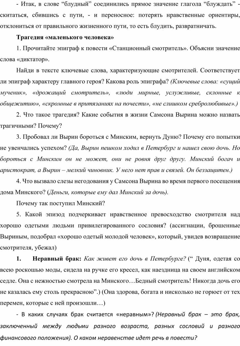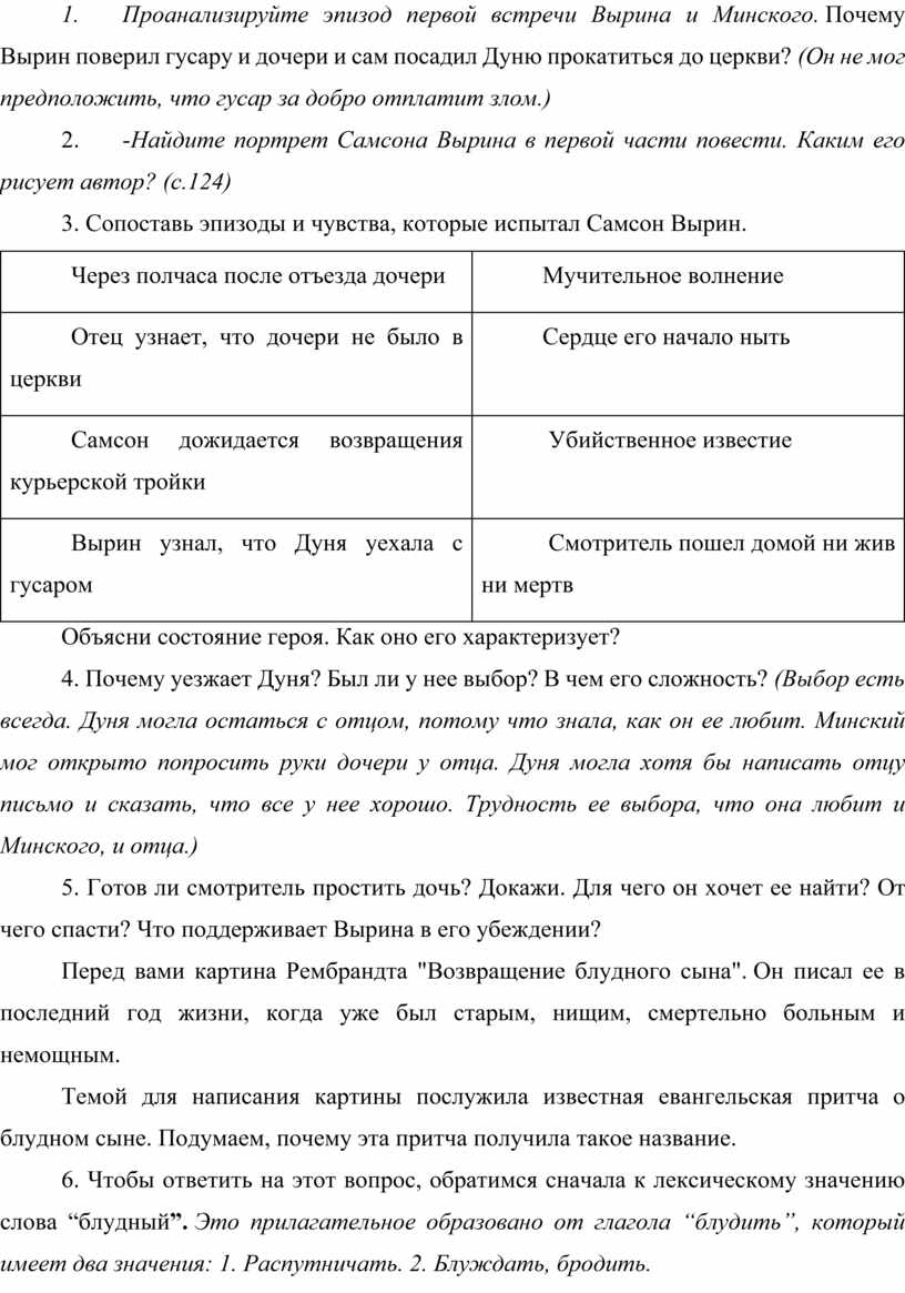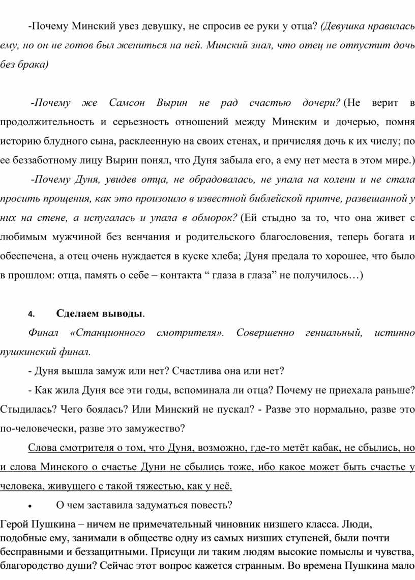 4. Почему уезжает Дуня? Был ли у нее выбор? В чем его сложность? (Выбор есть всегда. Дуня могла остаться с отцом, потому что знала, как он ее любит. Минский мог открыто попросить руки дочери у отца. Дуня могла хотя бы написать отцу письмо и сказать, что все у нее хорошо. Трудность ее выбора, что она любит и Минского, и отца.)