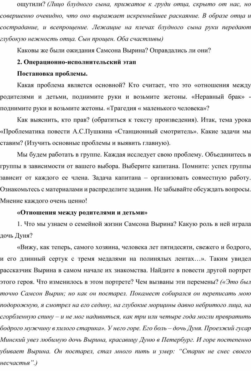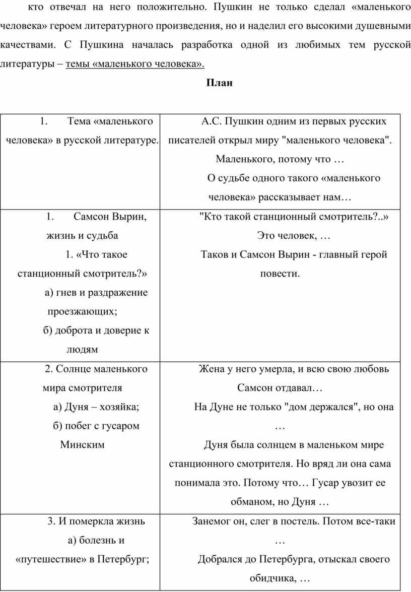 1. Самсон Вырин, жизнь и судьба 1. «Что такое станционный смотритель?» а) гнев и раздражение проезжающих; б) доброта и доверие к людям |