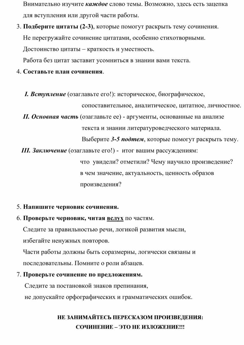 Не перегружайте сочинение цитатами, особенно стихотворными.