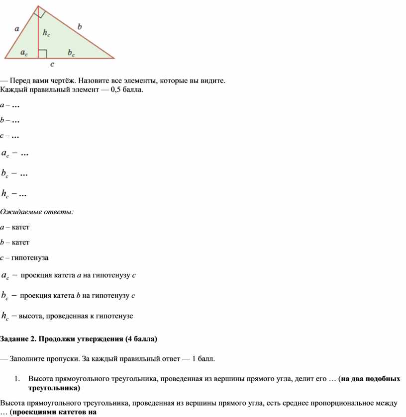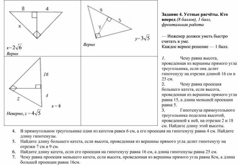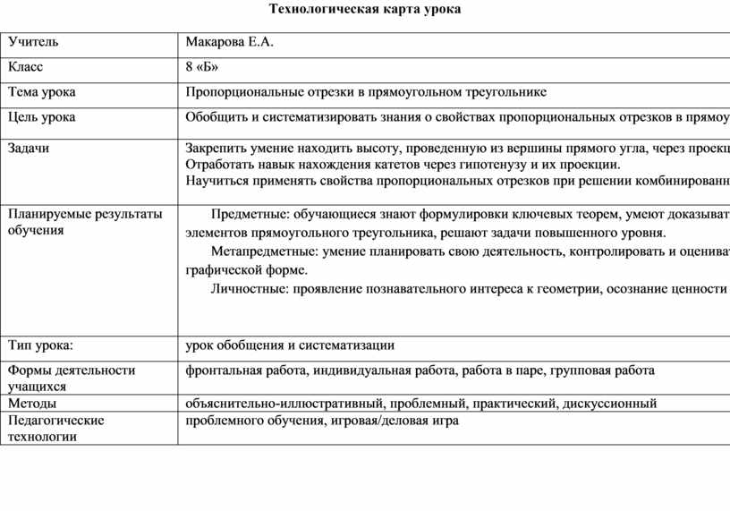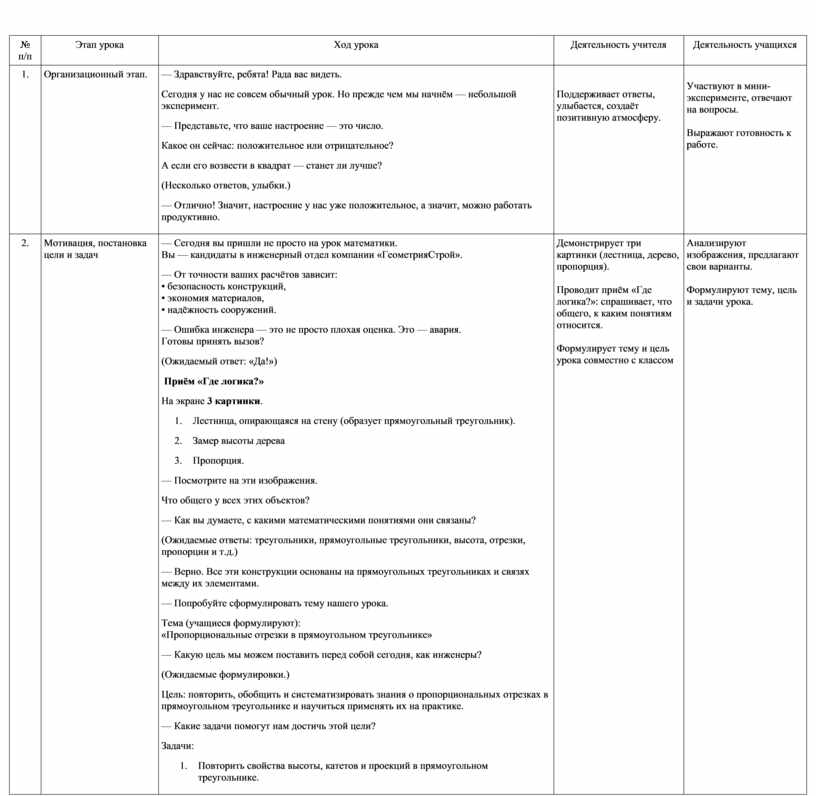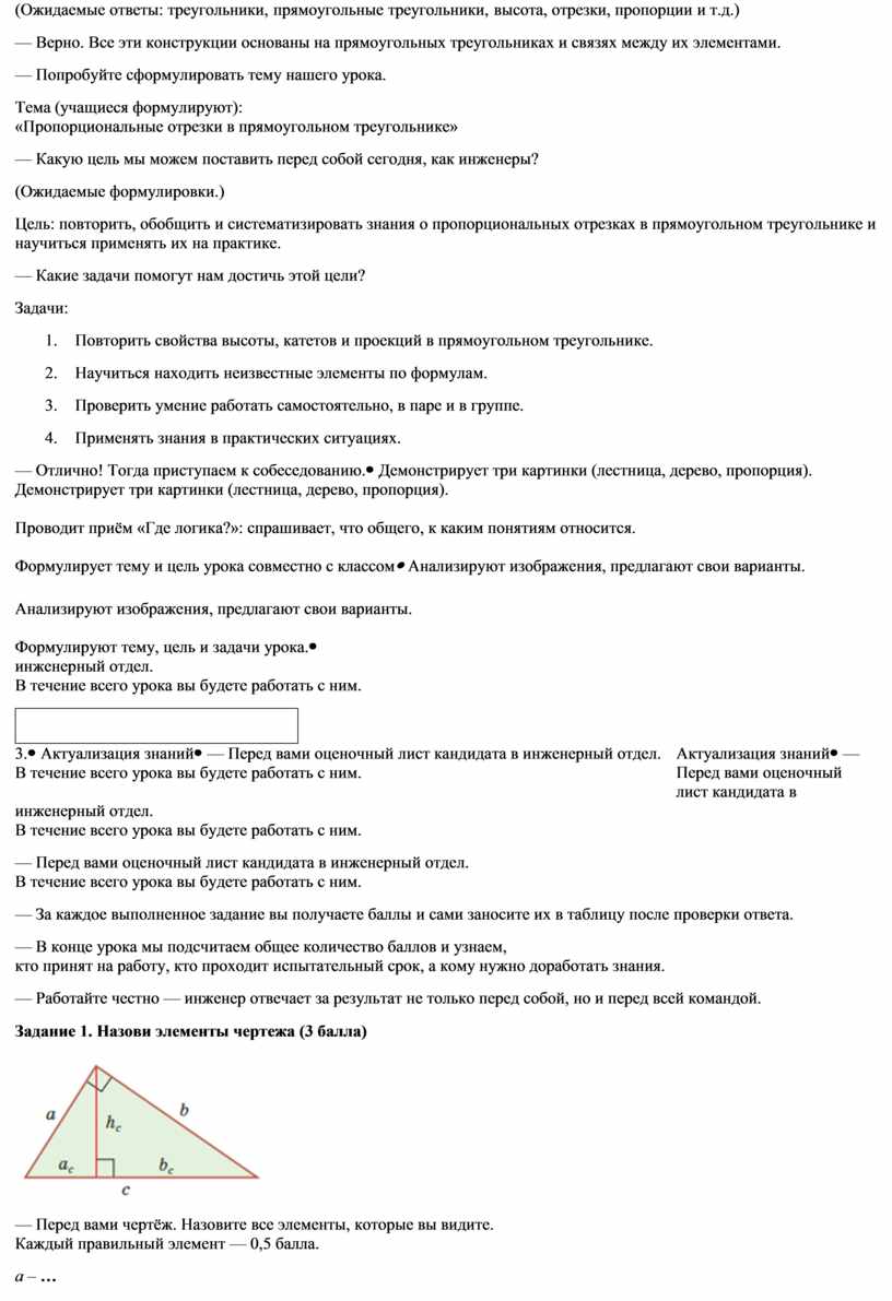 Ошибка инженера — это не просто плохая оценка. Это — авария. (Ожидаемый ответ: «Да!») Приём «Где логика?» На экране 3 картинки. 1. Лестница, опирающаяся на стену (образует прямоугольный треугольник). 2. Замер высоты дерева 3. Пропорция. — Посмотрите на эти изображения. Что общего у всех этих объектов? — Как вы думаете, с какими математическими понятиями они связаны? (Ожидаемые ответы: треугольники, прямоугольные треугольники, высота, отрезки, пропорции и т.д.) — Верно. Все эти конструкции основаны на прямоугольных треугольниках и связях между их элементами. — Попробуйте сформулировать тему нашего урока. Тема (учащиеся формулируют): — Какую цель мы можем поставить перед собой сегодня, как инженеры? (Ожидаемые формулировки.) Цель: повторить, обобщить и систематизировать знания о пропорциональных отрезках в прямоугольном треугольнике и научиться применять их на практике. — Какие задачи помогут нам достичь этой цели? Задачи: