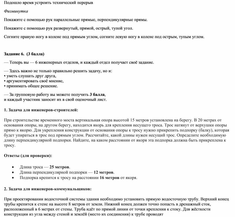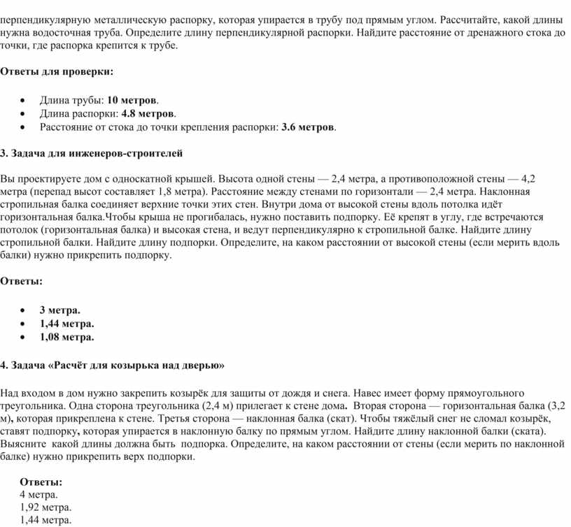 За групповую работу вы можете получить 3 балла, 1. Задача для инженеров-строителей: При строительстве временного моста вертикальная опора высотой 15 метров установлена на берегу. В 20 метрах от основания опоры, на другом берегу, находится якорь для крепления несущего троса. Трос натянут от верхушки опоры прямо к якорю. Для укрепления конструкции от основания опоры к тросу нужно прикрепить подпорку (балку), которая будет упираться в трос под прямым углом. Рассчитайте, какой длины нужен несущий трос. Определите необходимую длину перпендикулярной подпорки. Найдите, на каком расстоянии от якоря эта подпорка должна быть прикреплена к тросу. Ответы (для проверки): · Длина троса — 25 метров. · Длина перпендикулярной подпорки — 12 метров. · Подпорка крепится к тросу на расстоянии 16 метров от якоря. 2. Задача для инженеров-коммунальщиков: При проектировании водосточной системы здания необходимо установить прямую водосточную трубу. Верхний конец трубы крепится к стене на высоте 8 метров от земли. Нижний конец должен точно попасть в дренажный сток, расположенный в 6 метрах от стены. Труба идёт по прямой линии от точки крепления к стоку. Для жёсткости конструкции из угла между стеной и землёй (место их соединения) к трубе проводят перпендикулярную металлическую распорку, которая упирается в трубу под прямым углом. Рассчитайте, какой длины нужна водосточная труба. Определите длину перпендикулярной распорки. Найдите расстояние от дренажного стока до точки, где распорка крепится к трубе. Ответы для проверки: · Длина трубы: 10 метров. · Длина распорки: 4.8 метров. · Расстояние от стока до точки крепления распорки: 3.6 метров. 3. Задача для инженеров-строителей Вы проектируете дом с односкатной крышей. Высота одной стены — 2,4 метра, а противоположной стены — 4,2 метра (перепад высот составляет 1,8 метра). Расстояние между стенами по горизонтали — 2,4 метра. Наклонная стропильная балка соединяет верхние точки этих стен. Внутри дома от высокой стены вдоль потолка идёт горизонтальная балка.Чтобы крыша не прогибалась, нужно поставить подпорку. Её крепят в углу, где встречаются потолок (горизонтальная балка) и высокая стена, и ведут перпендикулярно к стропильной балке. Найдите длину стропильной балки. Найдите длину подпорки. Определите, на каком расстоянии от высокой стены (если мерить вдоль балки) нужно прикрепить подпорку. Ответы: