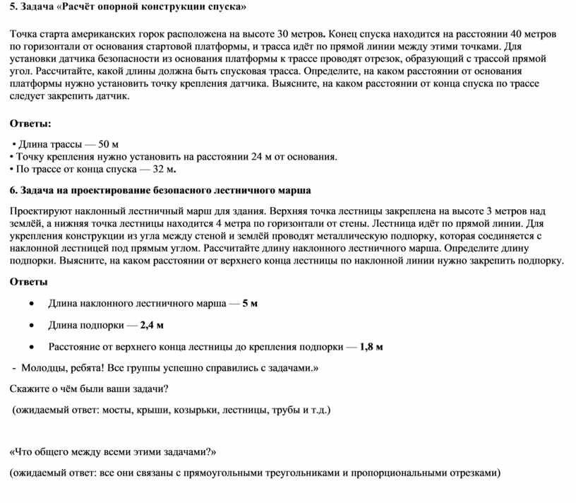 Ответы: 4 метра. 1,92 метра. 1,44 метра. 5. Задача «Расчёт опорной конструкции спуска» Точка старта американских горок расположена на высоте 30 метров. Конец спуска находится на расстоянии 40 метров по горизонтали от основания стартовой платформы, и трасса идёт по прямой линии между этими точками. Для установки датчика безопасности из основания платформы к трассе проводят отрезок, образующий с трассой прямой угол. Рассчитайте, какой длины должна быть спусковая трасса. Определите, на каком расстоянии от основания платформы нужно установить точку крепления датчика. Выясните, на каком расстоянии от конца спуска по трассе следует закрепить датчик. Ответы: •