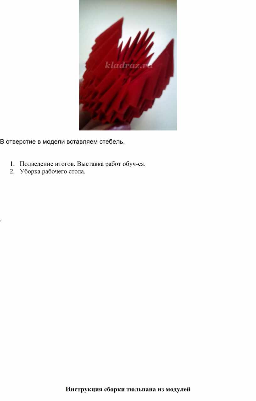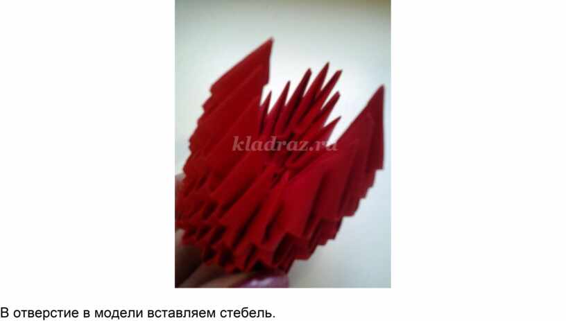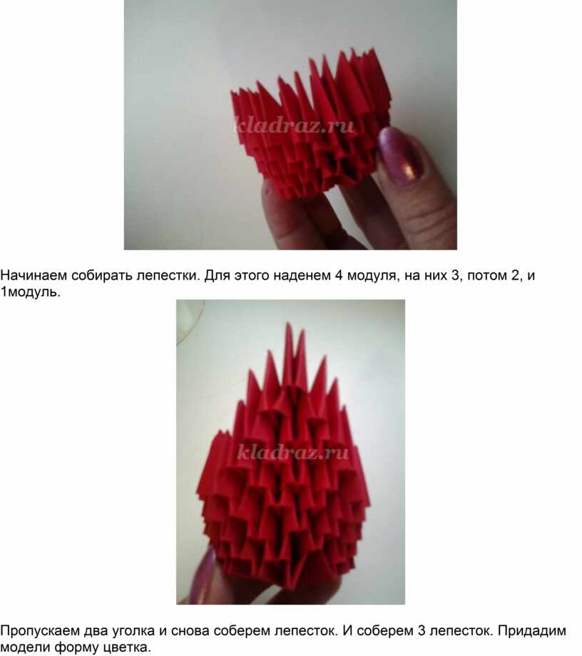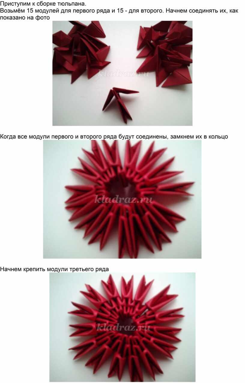Для одного тюльпана нам понадобится 75 треугольных модуля красного цвета, а стебель и лепестки нашего тюльпана мы уже сделали